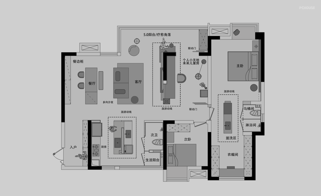 洄游动线上串联有公卫、洗漱台、洗衣烘干、设备间、厨房等功能。