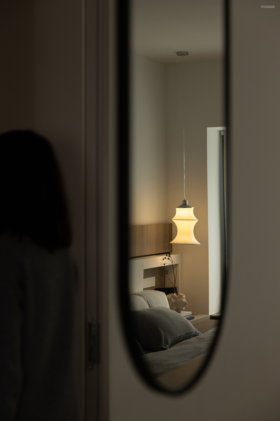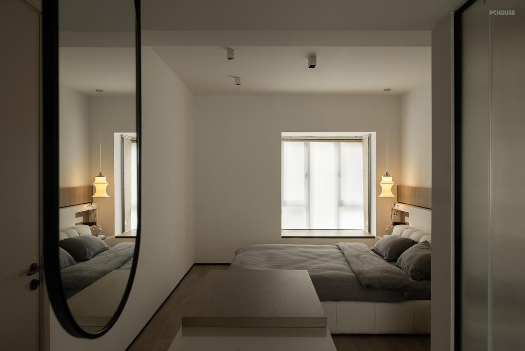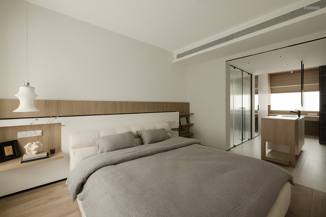 整个背景采用不对称的形式,而床头柜则并没有使用传统的抽屉柜,一边是定制和床头一体,另一边是成品可移动边几。这样能给人和谐、随意、放松的空间感。