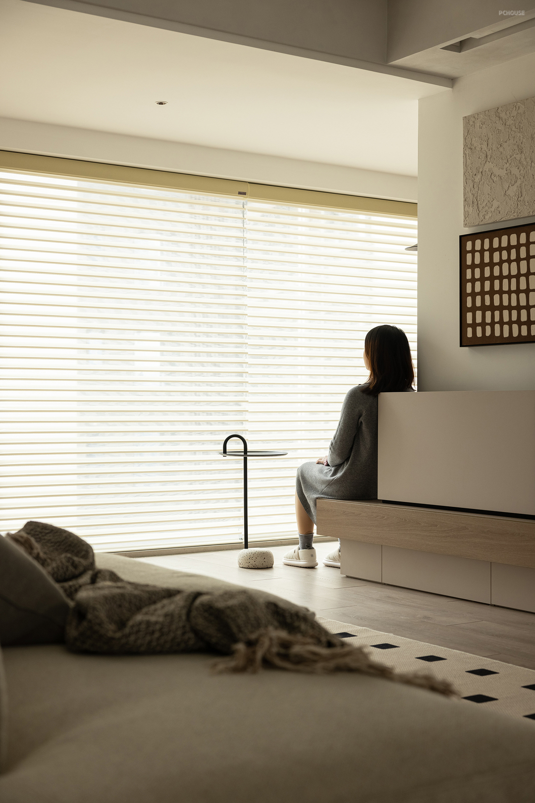 客厅悬浮柜延伸到阳台/疗愈角落,减少大面积柜体带来的厚重感。平时收起两个联动推拉门,如此布局带来了极为通透开阔的视觉空间,同时也把客厅阳台和小天地的区域边界模糊化,塑造出处处能被阳光拥抱的舒心感。