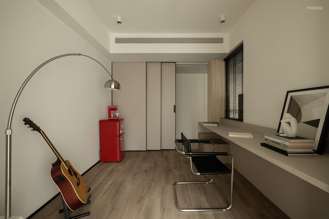 这个房间现阶段以开放为主,设计了两个联动门使空间可开可合,一边衔接疗愈角落,一边串联过道。而且客厅电视柜也和传统不同,它衔接阳台柜以及过道柜,且背面转为书桌构成有机整体,以这个多功能柜为中心,形成另一个洄游动线.