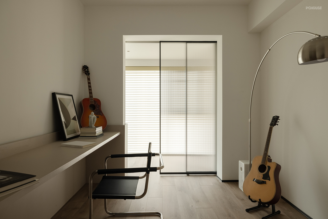 这里的个人小天地,左边墙体拆除后做了一组高柜方便过道储物;联动门的设计让这个空间更显开阔明亮。