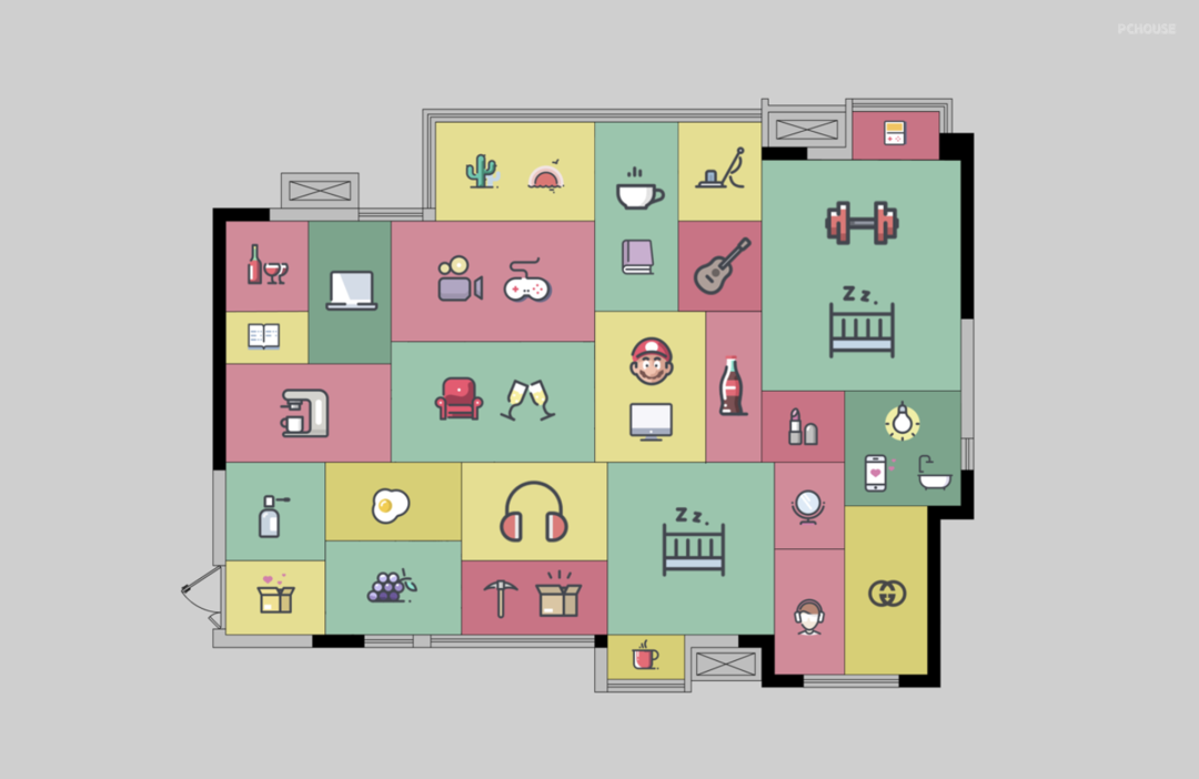 生活方式解读图:根据居住者的个性与喜好,以生活方式模块化来规划空间,示意日常生活场景。