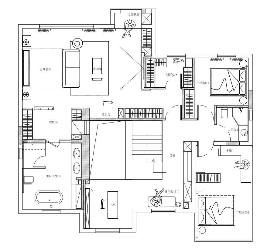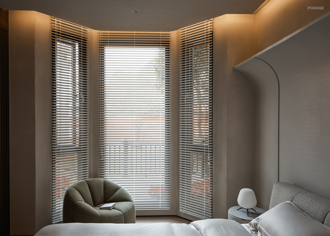 一楼只有一个正式的卧室,在楼梯的旁边,隐形房门是正反双色的,房间里面的八角窗、旋转的休闲沙发、弧形背景的造型和梳妆台,每一个细节都让人在日常生活中也能感受到艺术的魅力,也可以找到心灵的平静。