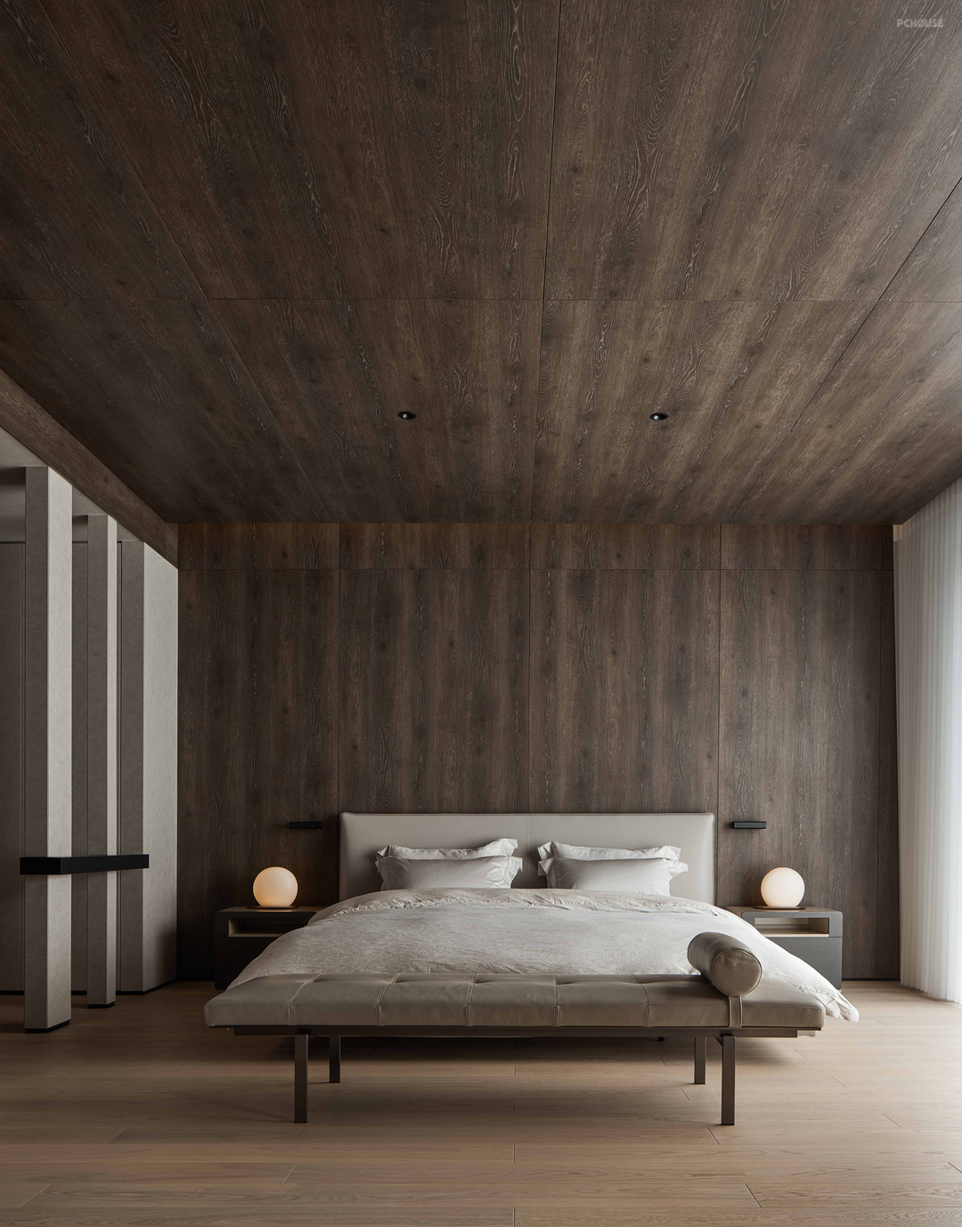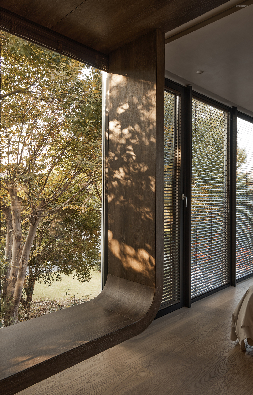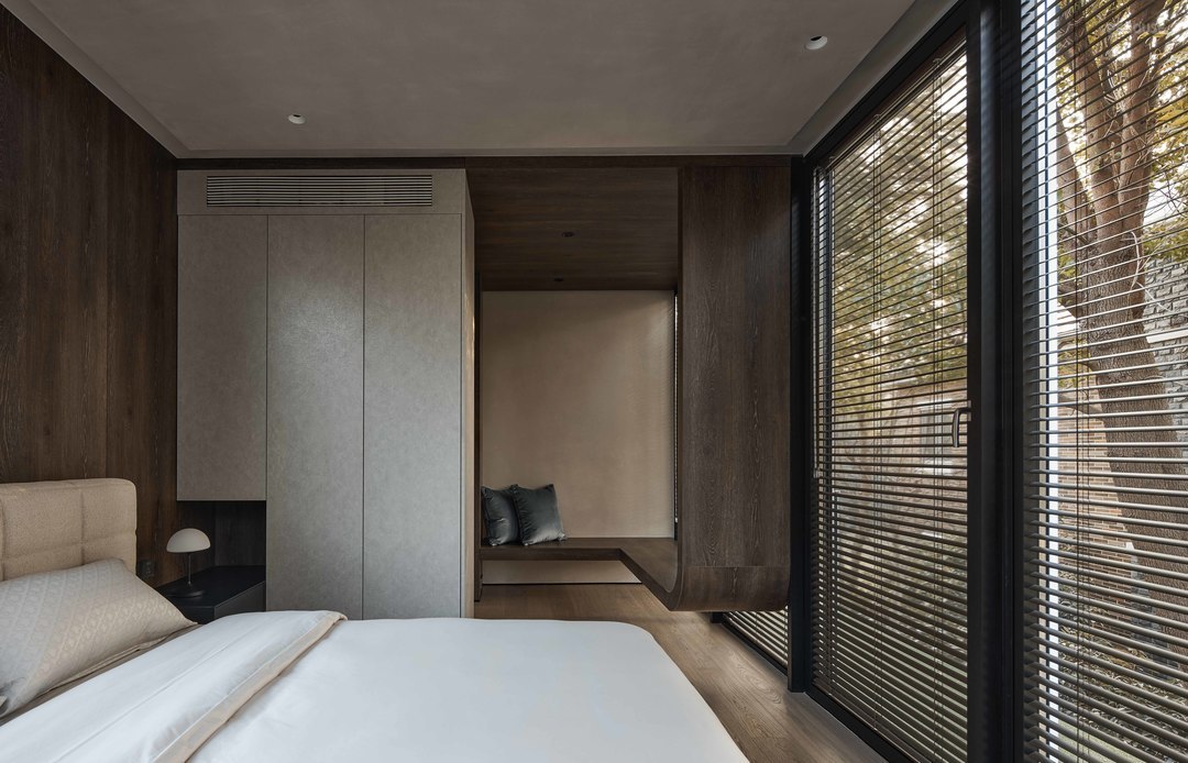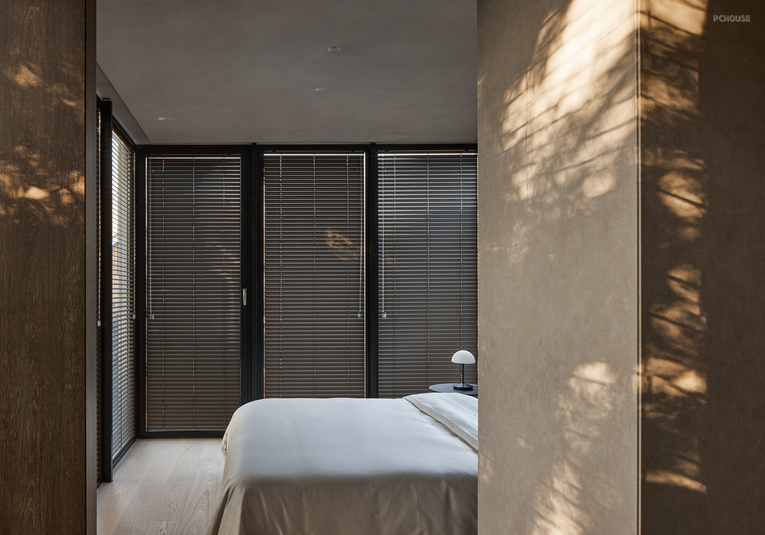 主卧室是一个宽敞明亮的空间,大大的落地窗外是绿茵茵的,木质的纹路和色泽,以及光影在空间的美,整体空间感受给人多么温馨自然的氛围。我内心叹息此空间拍摄的照片不能传达真实的感受给读者,是有点点可惜的~