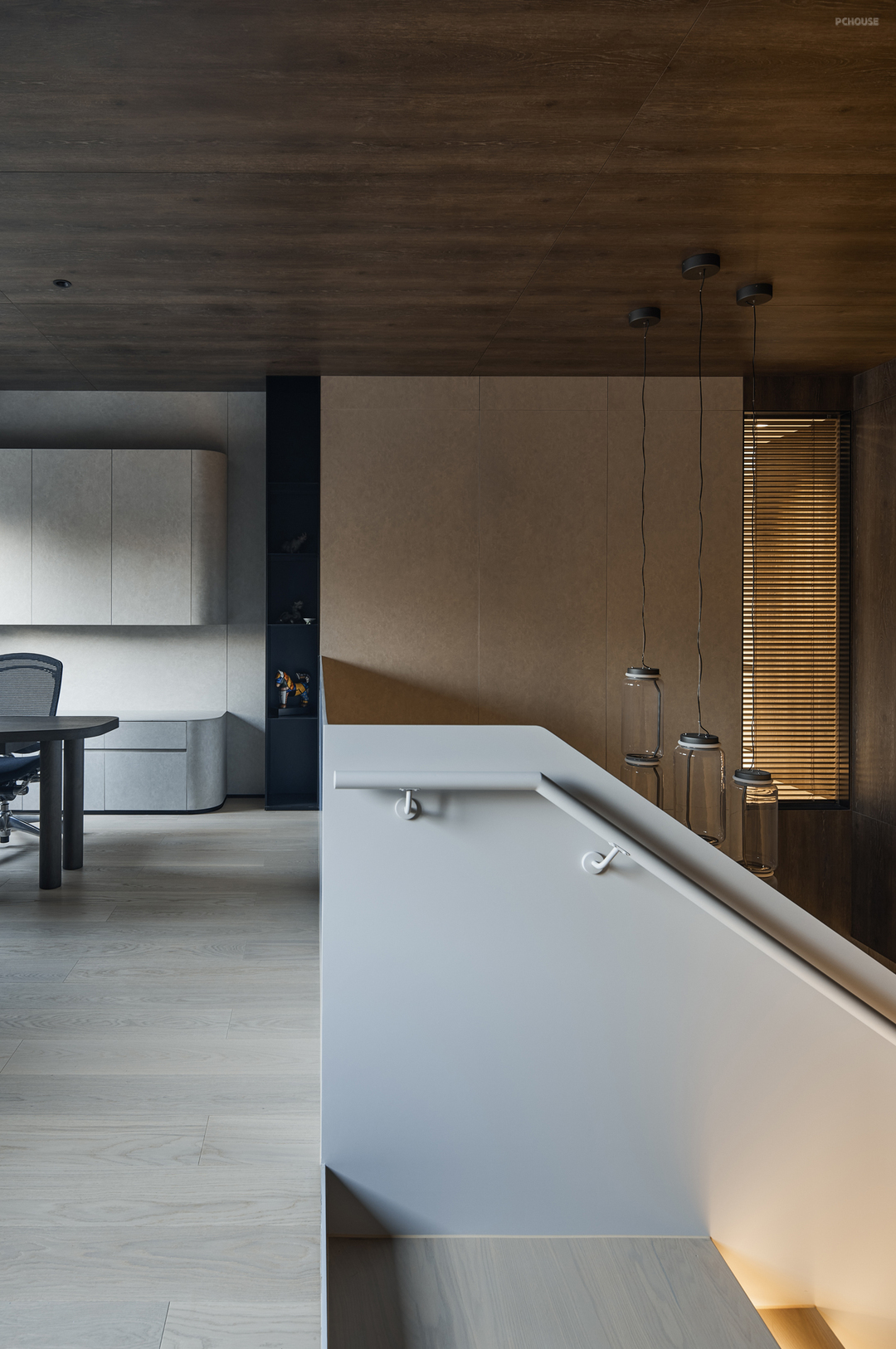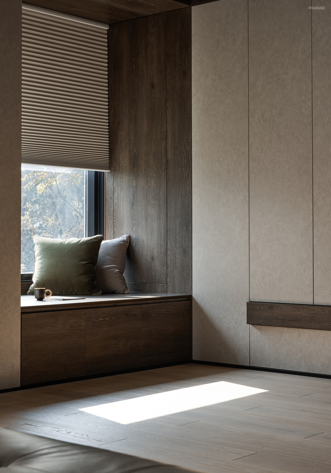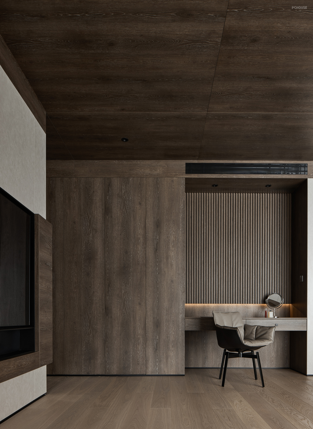 主卧室是一个宽敞明亮的空间,大大的落地窗外是绿茵茵的,木质的纹路和色泽,以及光影在空间的美,整体空间感受给人多么温馨自然的氛围。我内心叹息此空间拍摄的照片不能传达真实的感受给读者,是有点点可惜的~