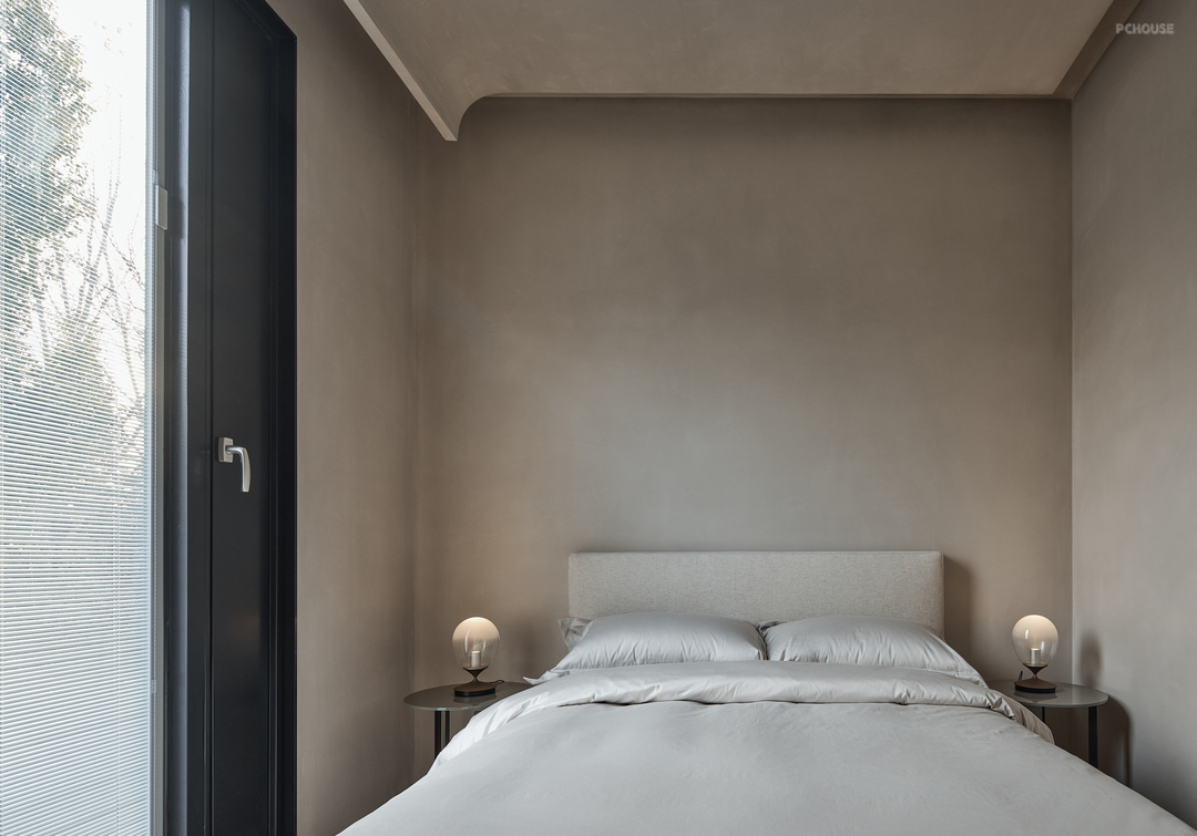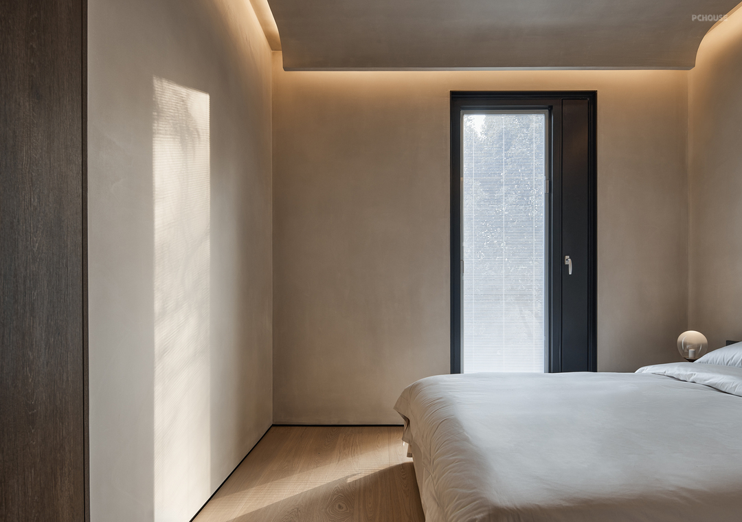 这个卧室是空间最小的,却是干脆利落的,没有一丝多余的空间浪费,每一个角落都承载着独特的功能和意义,简洁而不失温馨。阳光下的物件都显得生动而富有活力,仿佛被赋予了生命,墙上的影子斑驳陆离,增强了空间的层次感。