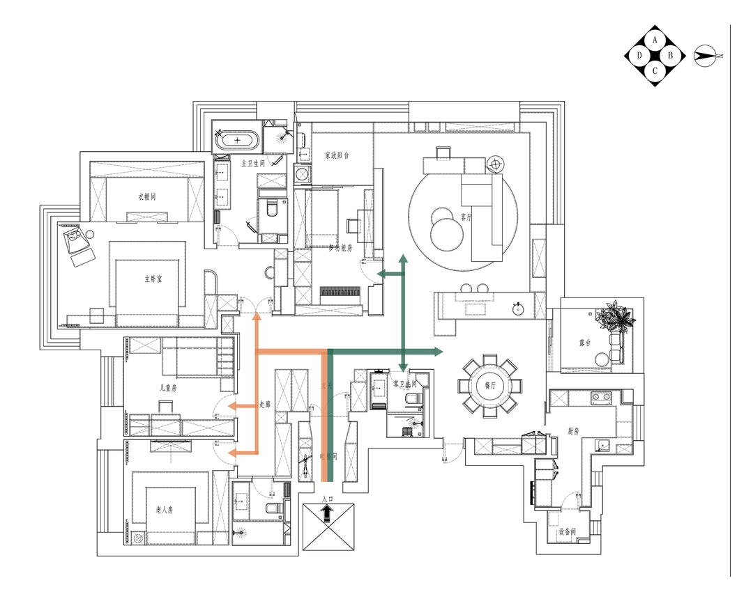 本案是一个大平层,原户型整体布局和动线杂乱,且单空间的独立性很强,对于一个三代同堂且孩子年纪尚小的家庭来说,互动性很差,转角太多,部分空间的采光和空间大小也并不舒适,因此我们进行了较大的拆改,来满足属于这个家庭的生活空间。