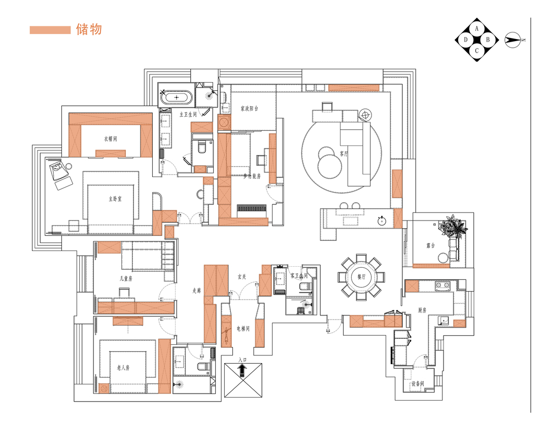 图一是储物布局图,全屋采取散点式布局,最大化增加整体储物能力,并利用储物柜做隔断和墙面补齐。