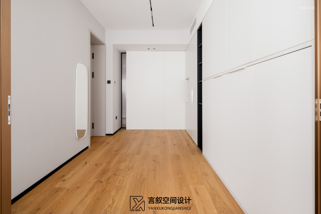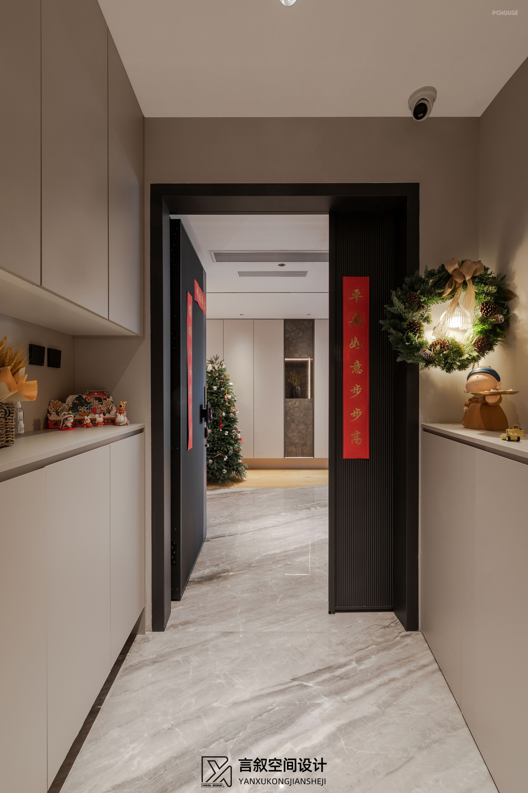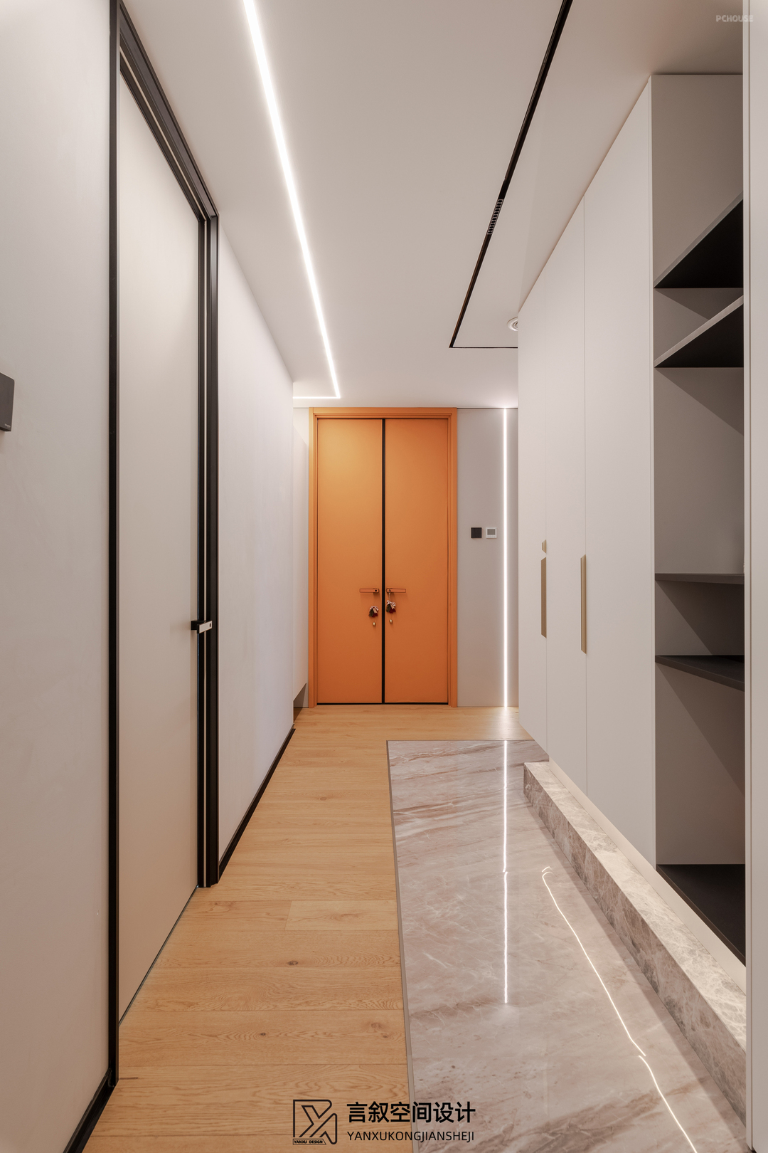 一梯一户的户型,电梯到入户门部分就可以充分利用起来,我门将原室内的一部分储物移至外侧,做统一定制储物。减轻了内玄关的储物压力。打开后的内玄关与过道相连,空间更通透。