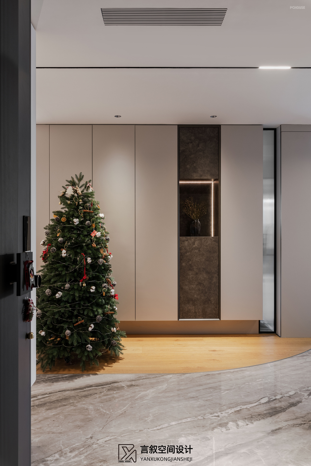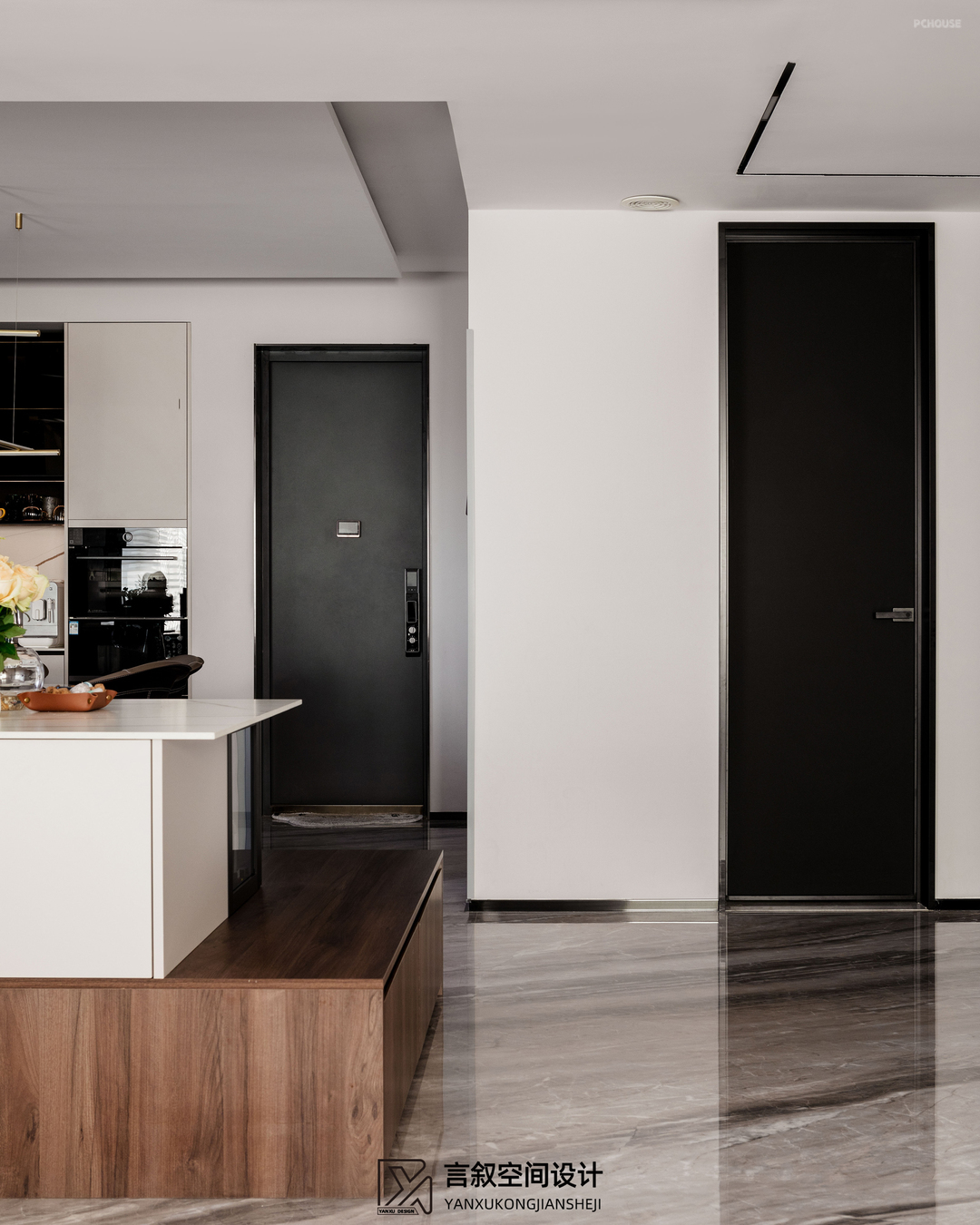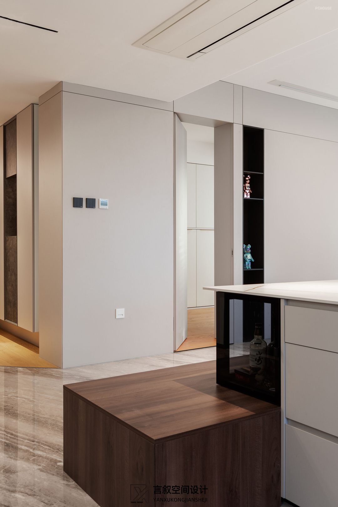 一梯一户的户型,电梯到入户门部分就可以充分利用起来,我门将原室内的一部分储物移至外侧,做统一定制储物。减轻了内玄关的储物压力。打开后的内玄关与过道相连,空间更通透。
