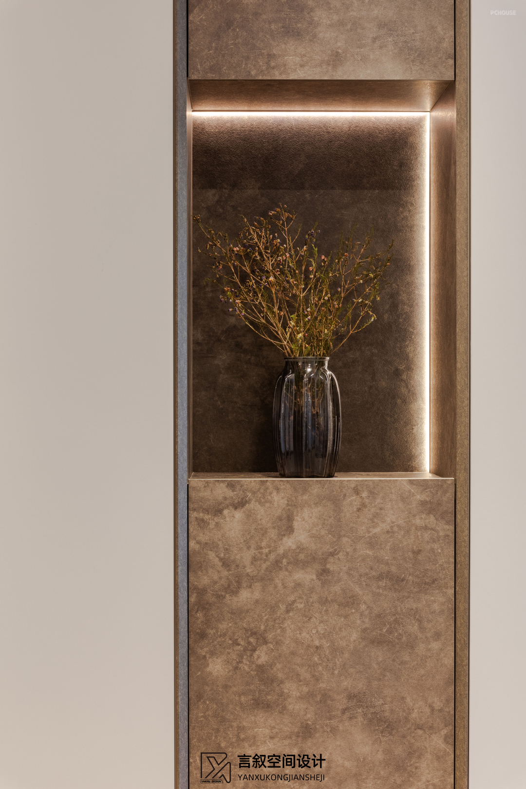 入户门正对面利用储物柜做了小景设计,色彩的深浅变化,材质的拼接,灯光的搭配,抬眼就是心意。