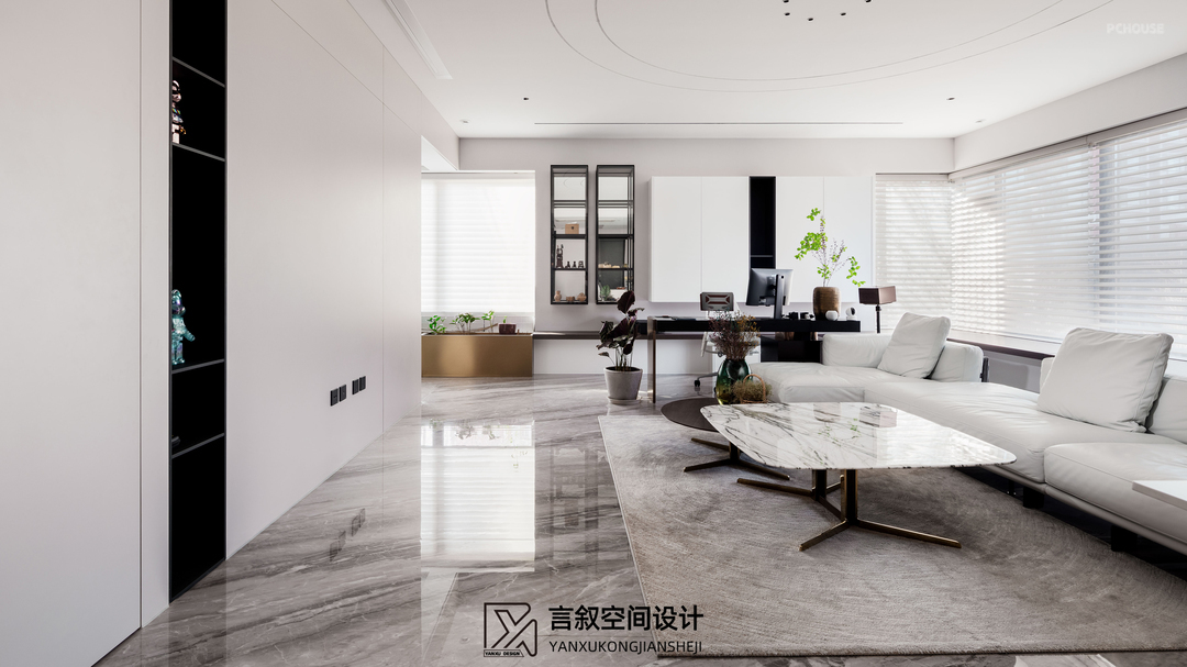 客厅里侧角落添置了办公区,简洁的桌椅并不遮挡光线。背墙做悬空柜+悬吊镜柜设计,解决储物需求的同时,黑白配色与镜面的搭配增加层次感、空间感。