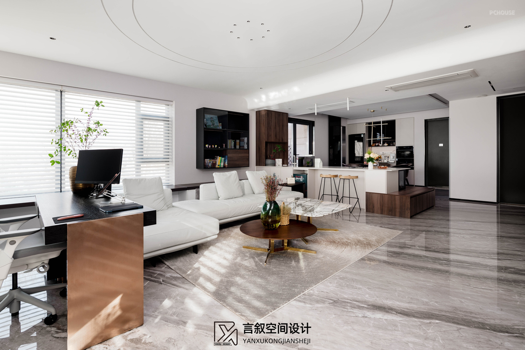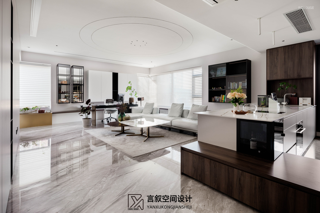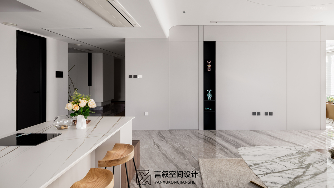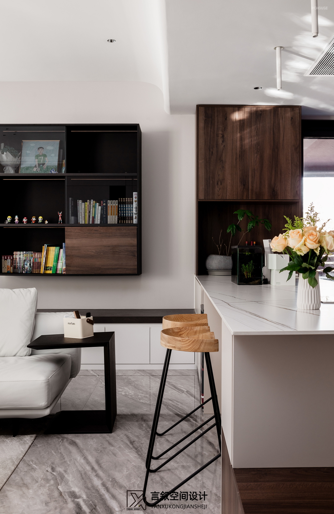 屋主日常也会需要在家办公,并有一个不到10岁的小男孩。更希望家人的日常互动可以多一些,因此我们并没有在客厅做过多复杂的装饰,而是尽量留白设计,并将客餐厨一体规划设计,在客厅加入高度差吧台。