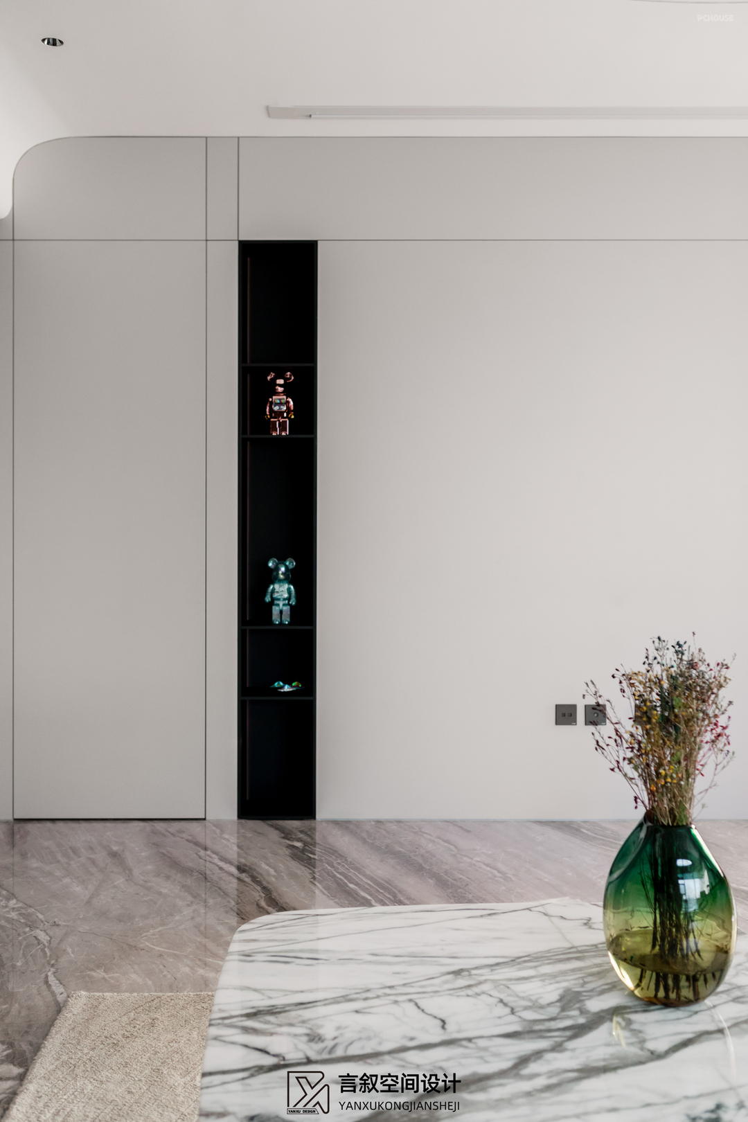 单开一竖条的黑色开放式格柜,配上一些饰品,打破了整面墙的素白木讷。远视有层次,近视有细节。