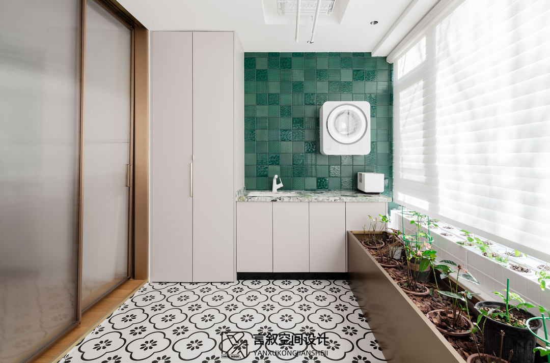 原客厅旁边的茶室对屋主来说利用率并不高,而屋主的父母很希望在家里能种一些有机蔬菜。因此我们将茶室打开与客厅贯连,改为开放式的家政阳台,储物柜+台盆+mini洗衣机做日常洗护和家政工具存放。