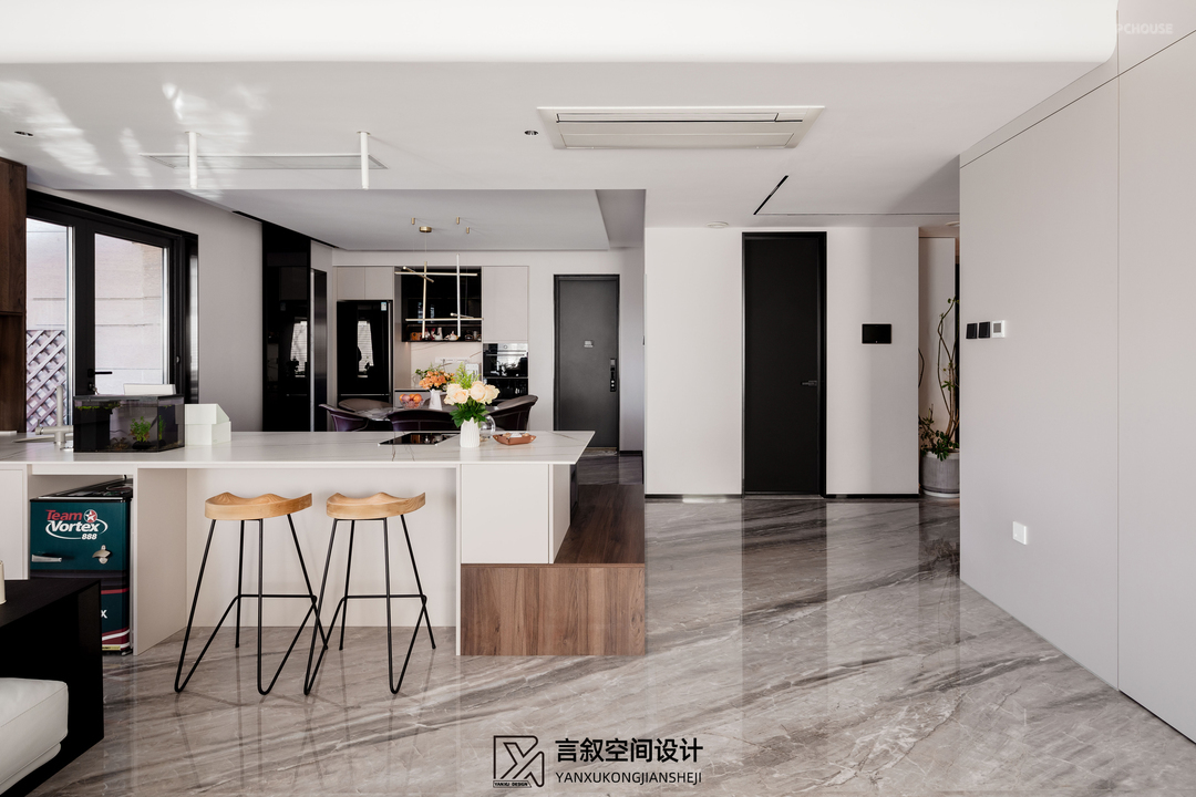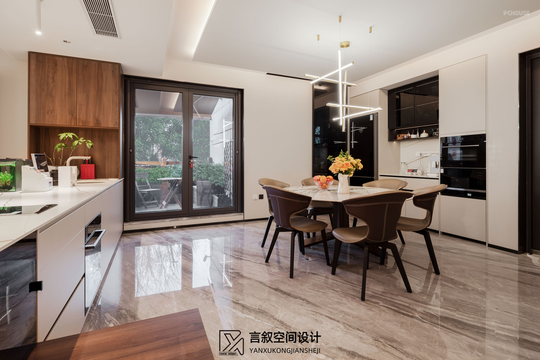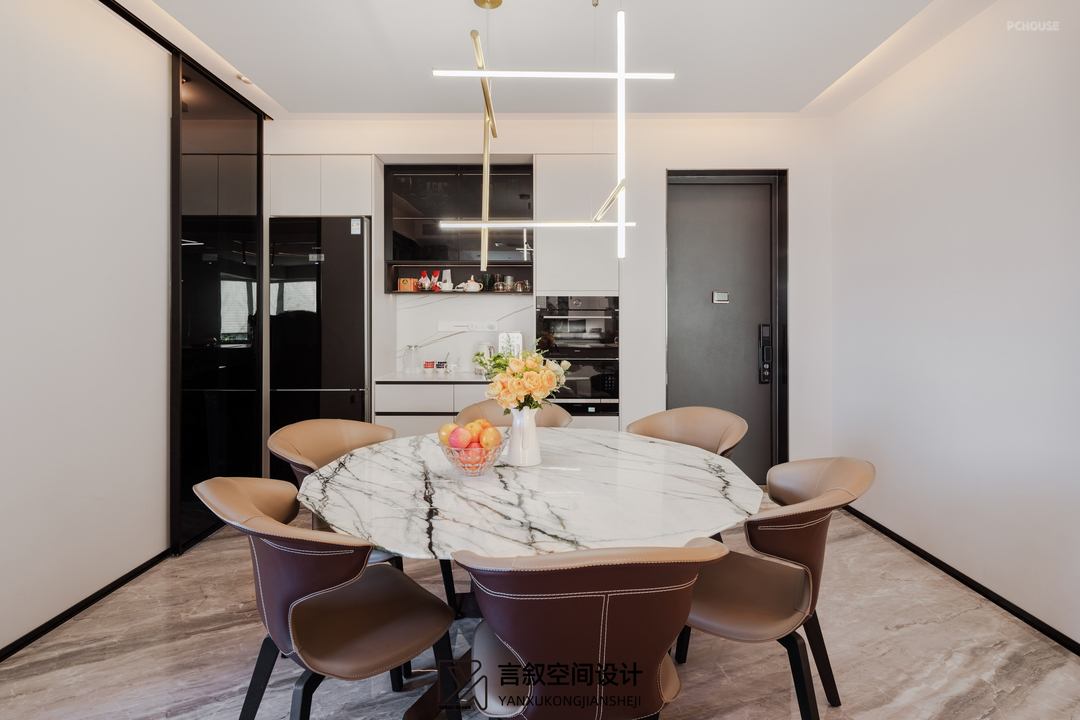 在客餐厅设计上,我们改变了原来的单一餐桌,选择将餐厅区分为岛台+西厨+用餐区,实现了餐厅的多样性。也减轻了厨房内的储物和设备压力。