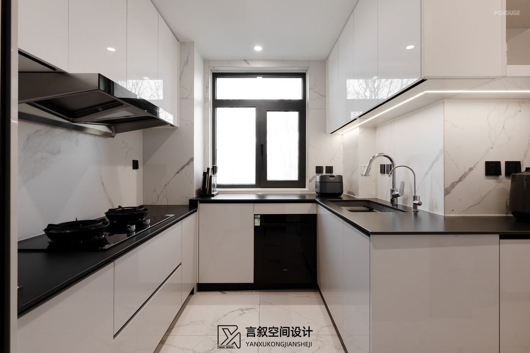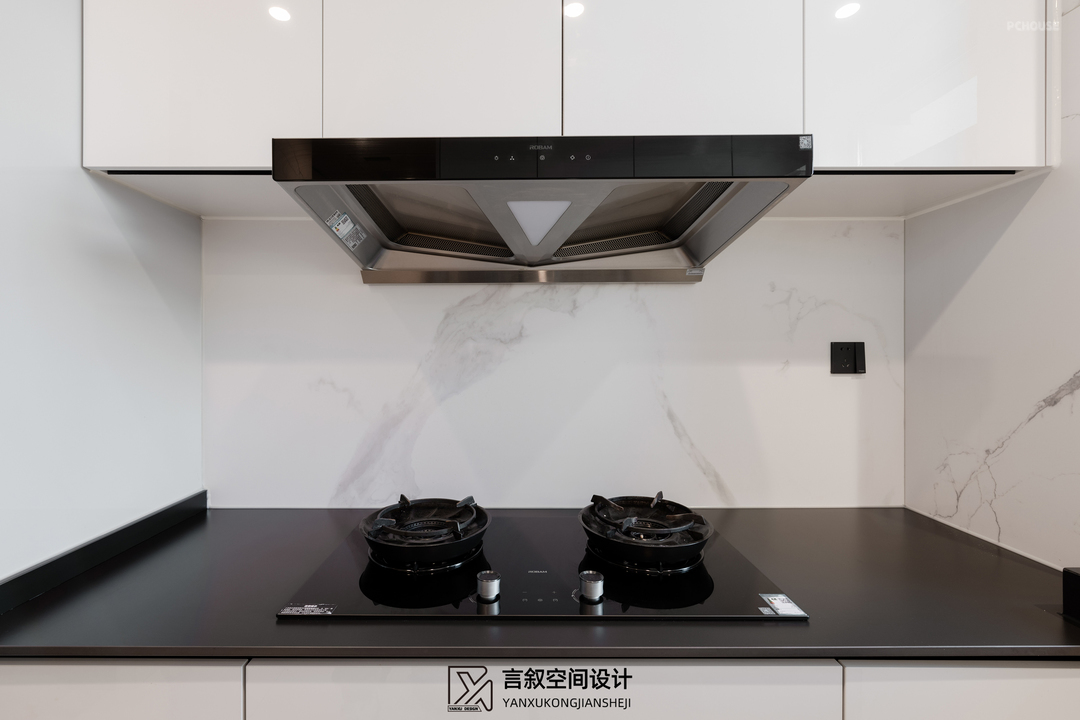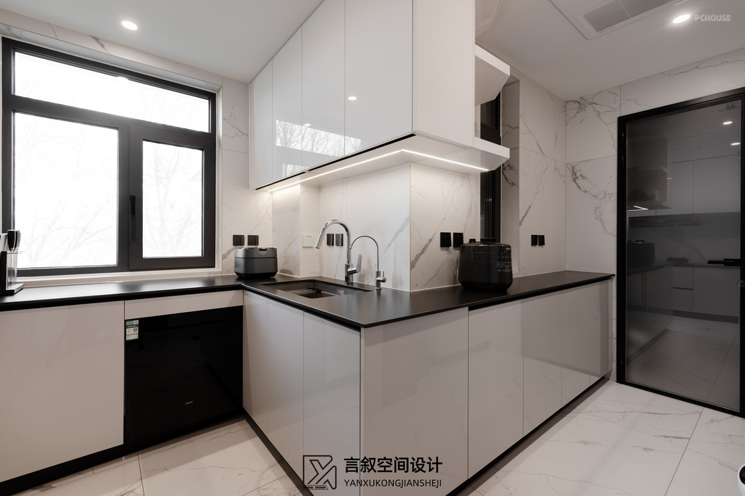 橱柜黑白经典配色,无把手按压式柜门视觉更简洁干净且方便开关;内嵌冰箱、微波炉等厨电设备,与黑色玻璃展示柜融为一个整体;台面存放小厨电配轨道插座,便捷实用。