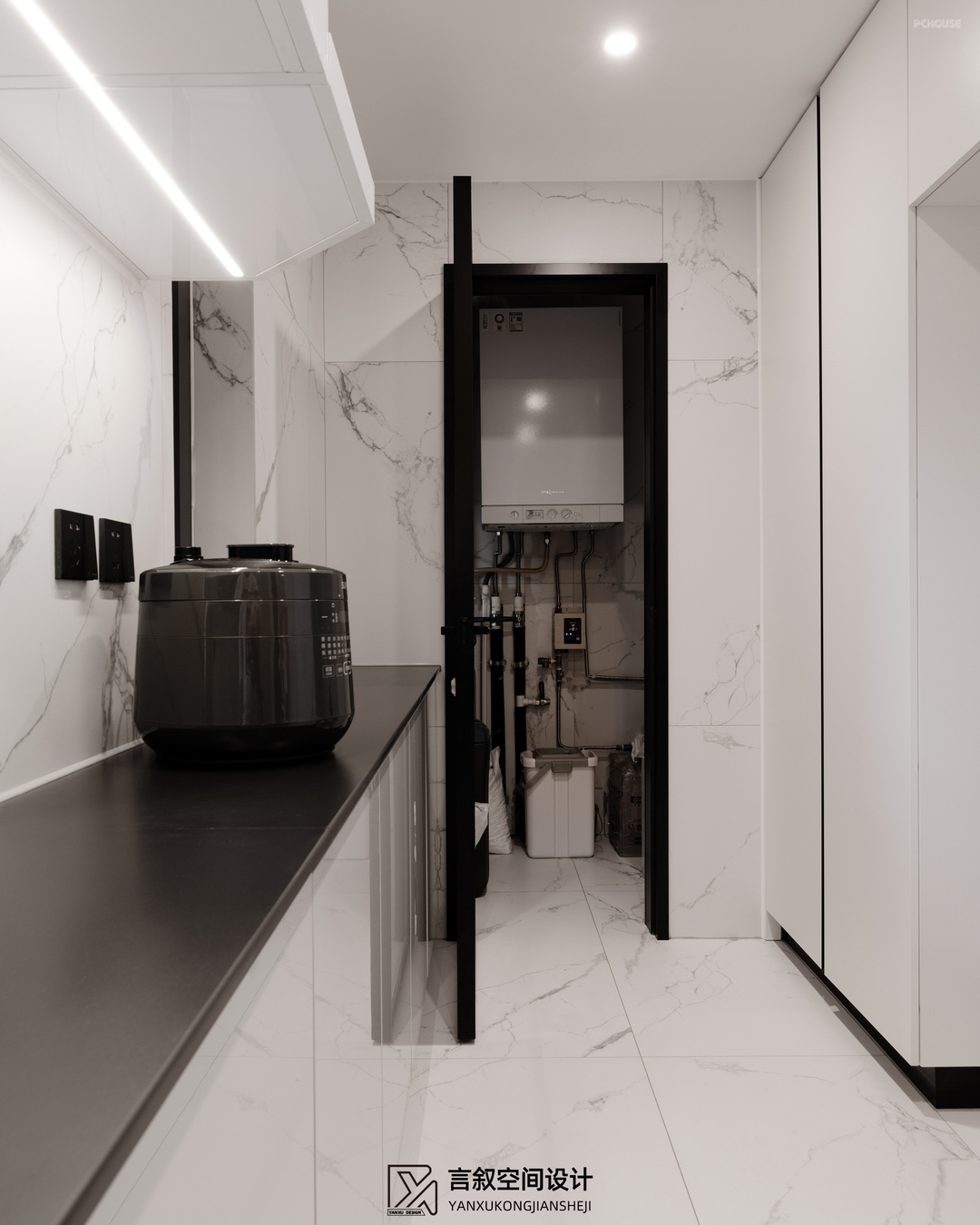 为了最大限度的布局厨房内的空间,我们采用600mm宽的黑色岩板台面+白色烤漆橱柜,将整个厨房区沿墙串联起来。柜门按压式,方便单手拿取物品。