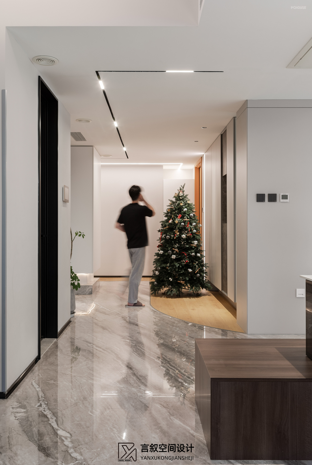 在前期的设计规划时,我们利用灯光、地面拼接等为屋主做了明确的主客动线设计,将屋主休息区与会客区做区分,能更好的保护屋主的隐私。