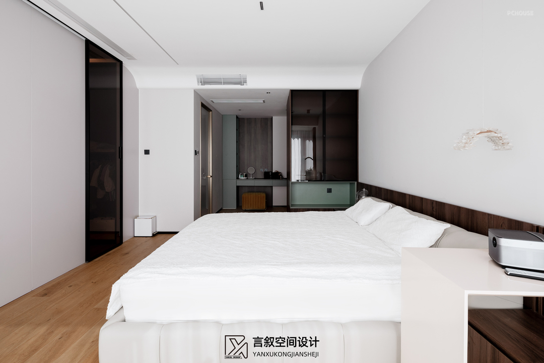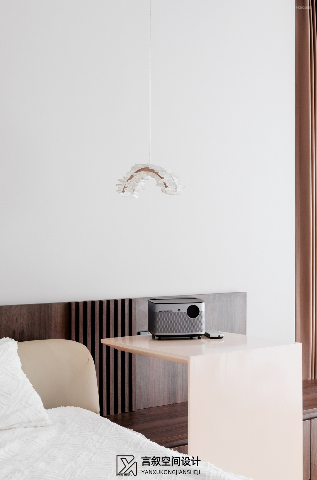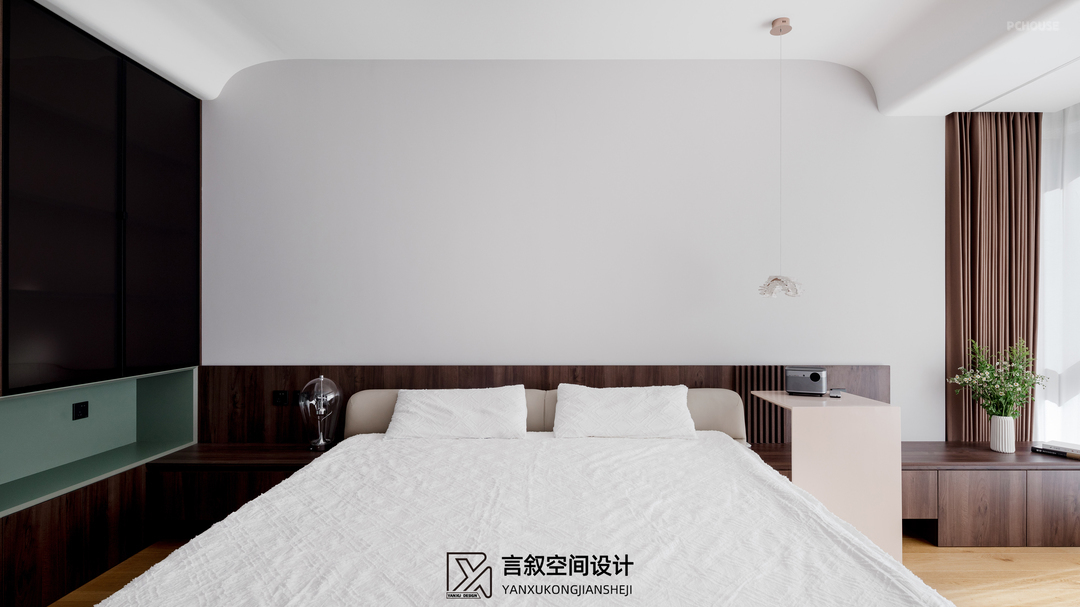 卧室吊顶和梁结构也是采用弧面过度,弱化锋利的转角。面包床的松软感增加了入睡的舒适度。床头不是很高,所以我们在卧室墙做了木饰面拼贴,延伸至两侧的定制床头柜。