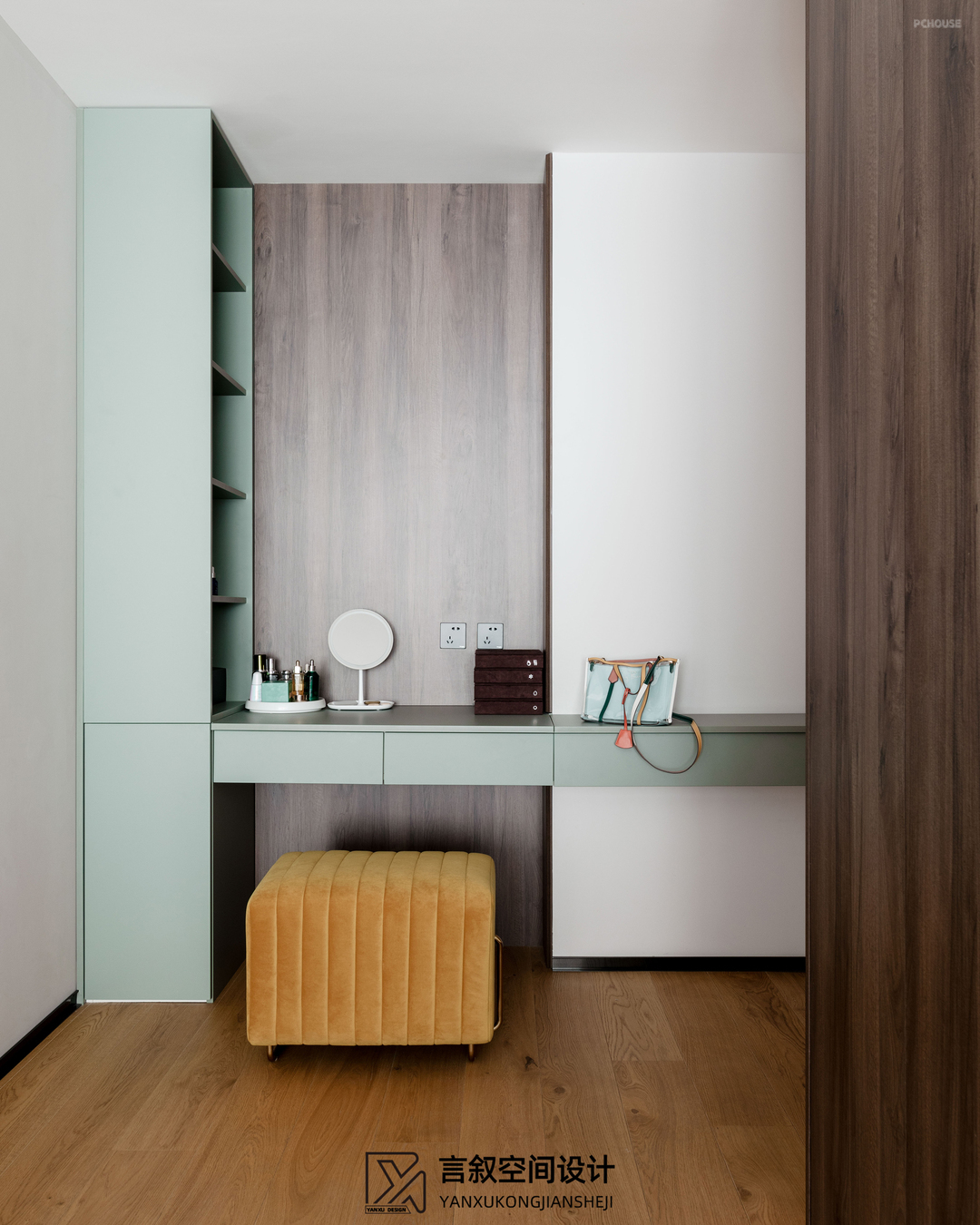主卧入户门转角处空间做了梳妆台,卧室唯一的色彩处理,通顶定制柜+悬空桌,地板上墙叠加墙面的层次感,灰绿色的漆面和橙色的沙发凳组合,简洁精致。