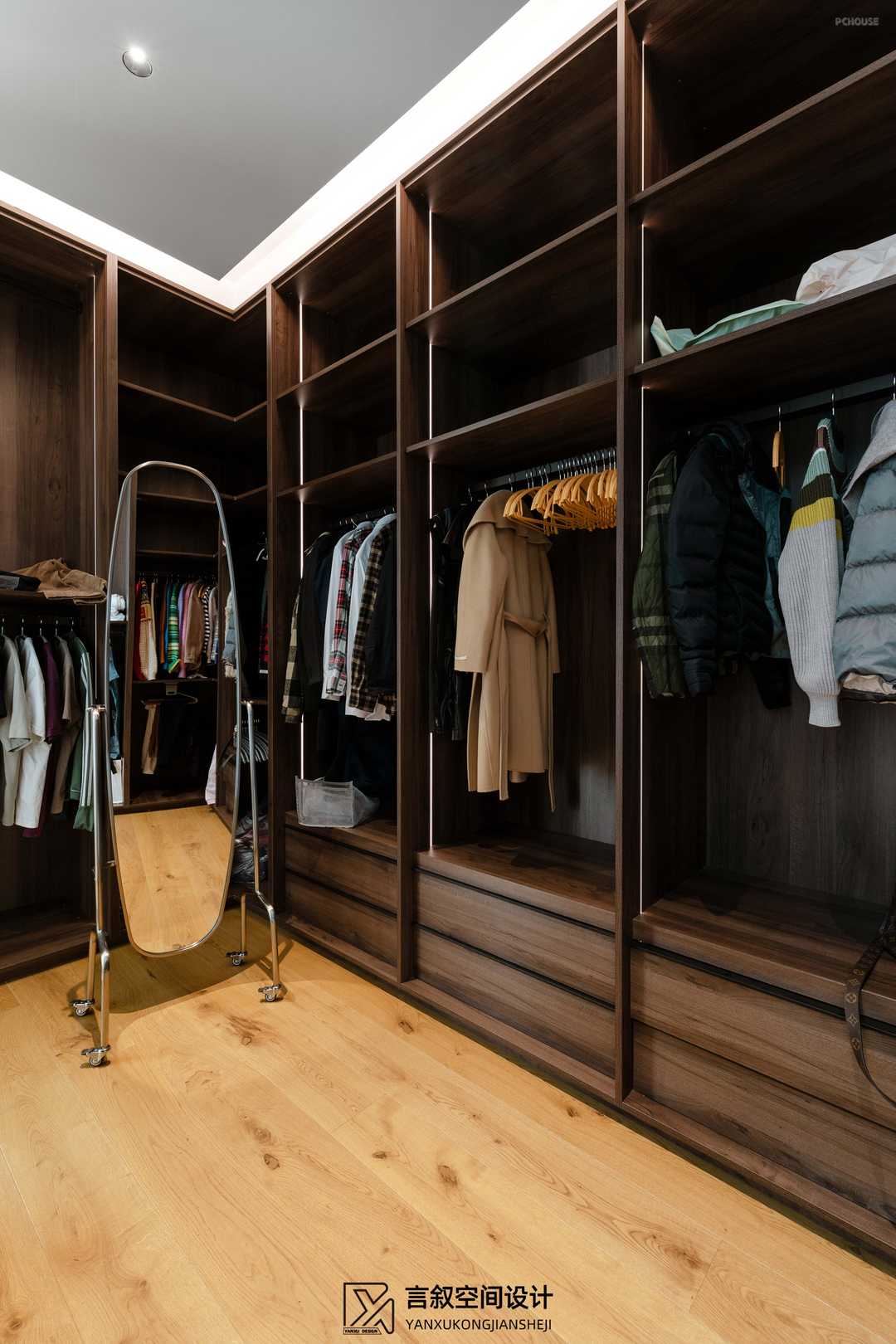 独立的衣帽间内部采用的开放式分区格柜,能存放更多的衣物,加入线条光辅光照明,查找衣物更加方便。