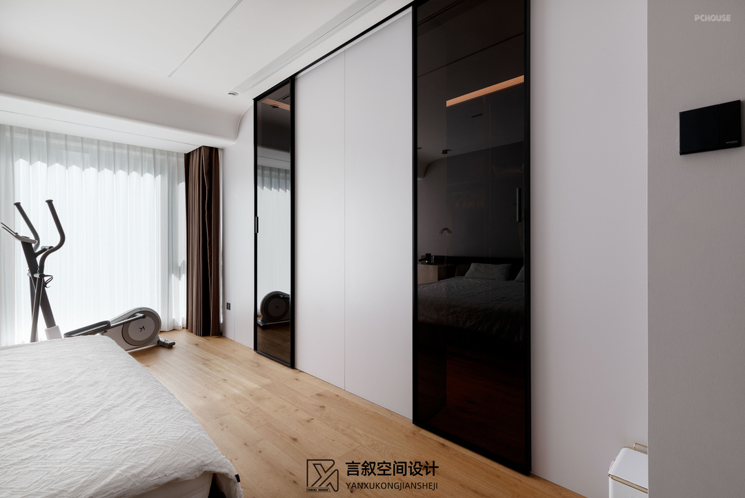 休息区的储物柜和衣帽间的谷仓门设计都采用黑色玻璃,通透有装饰感,也能调和空间色系。