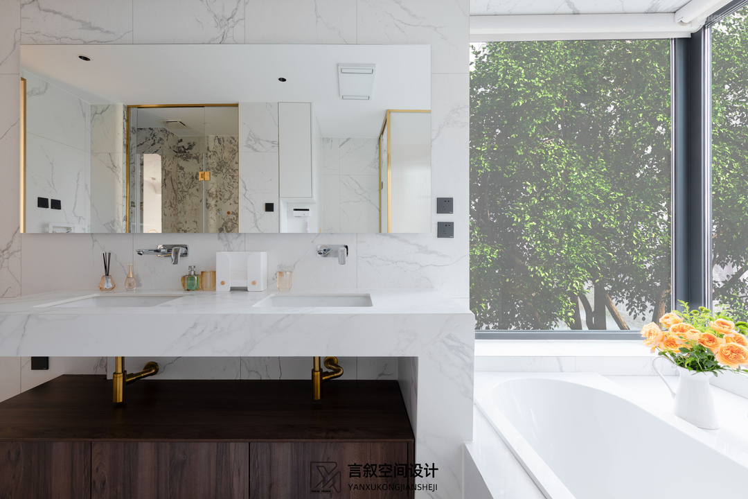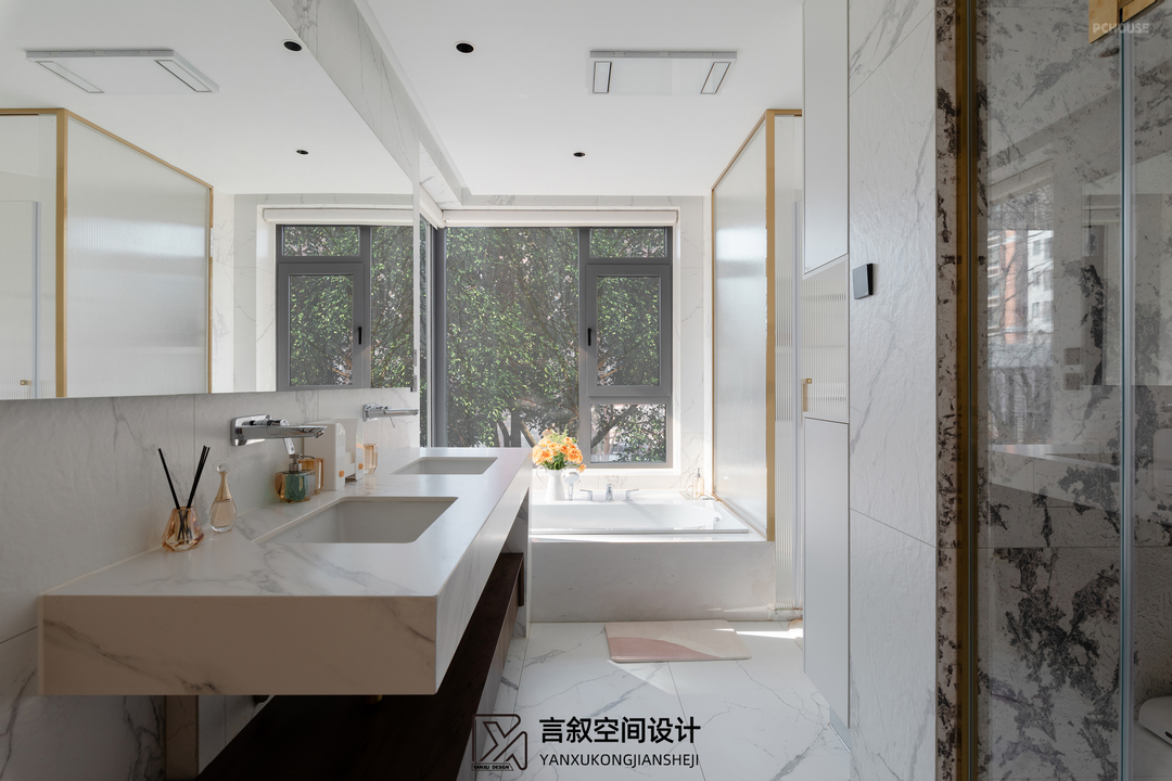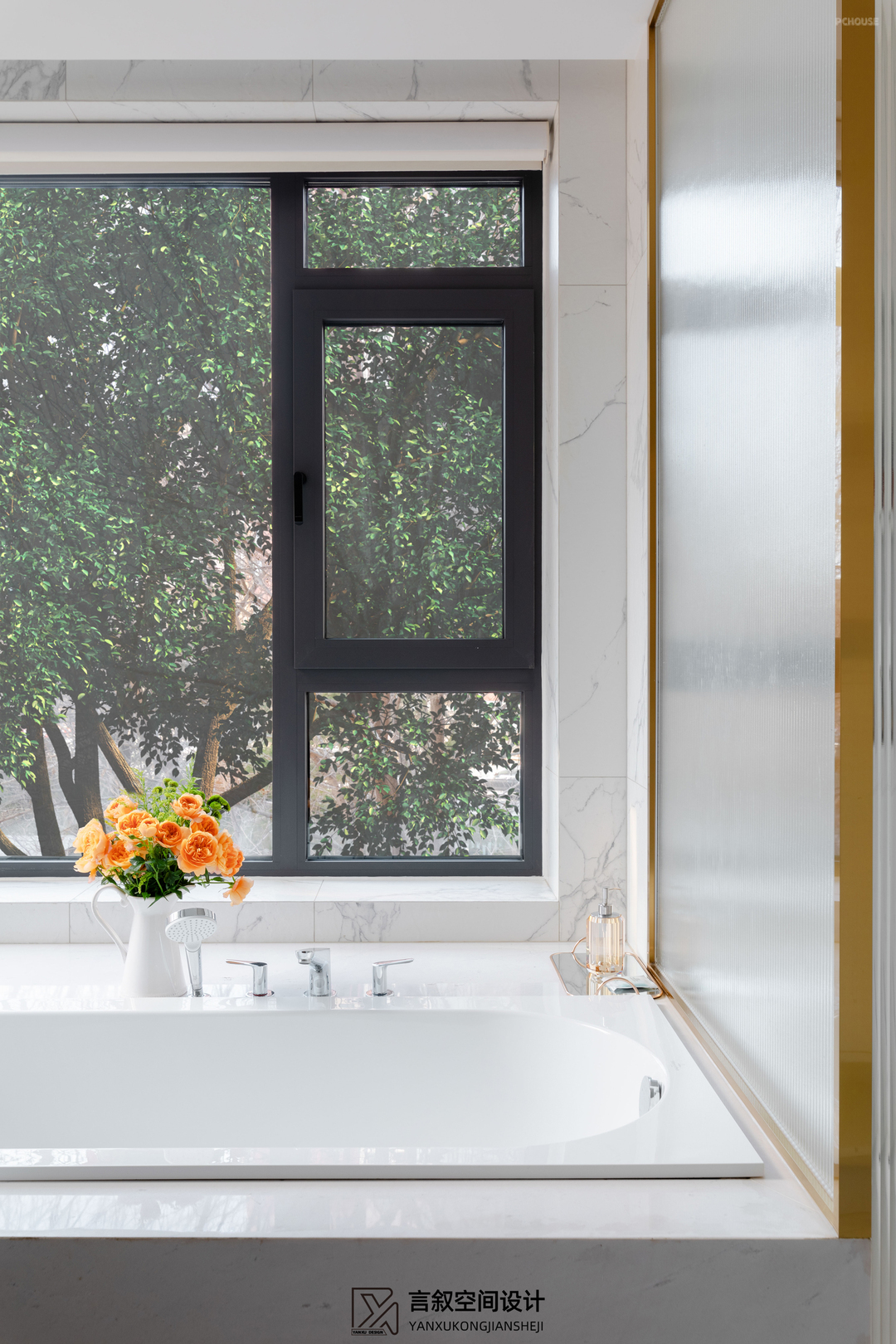 主卧卫生间我们做了分区设计,即干湿分离、卫浴分离。窗边浴缸既不遮挡窗景也让泡澡更安逸。