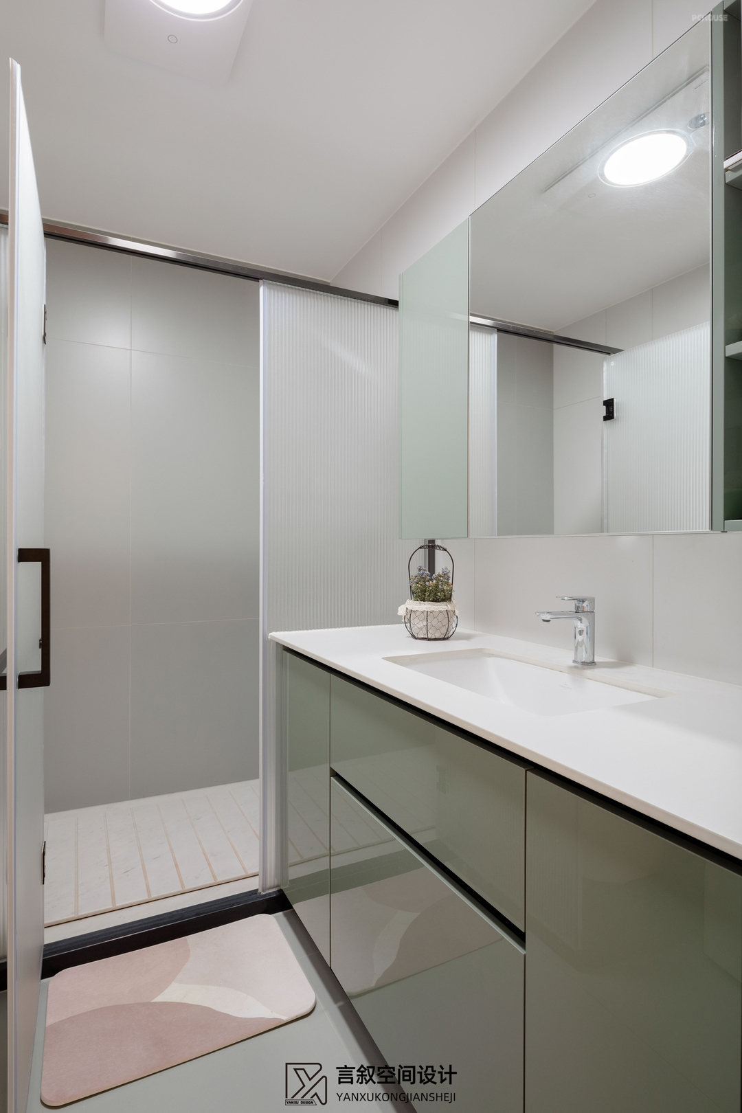 次卫整体采用低饱和度的灰绿色,与卧室内的色彩进行呼应。同样的墙排和镜柜解决了清扫和收纳问题。