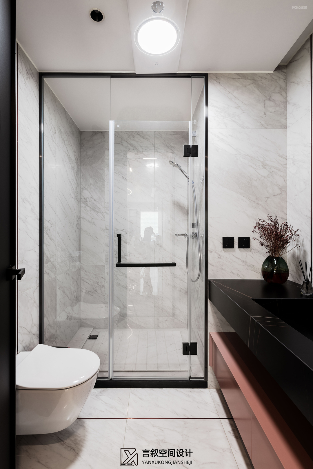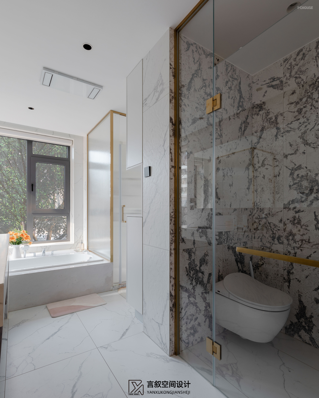 利用玻璃隔间独立卫生空间,透光性很好。墙面贴了区别于其他墙砖的艺术大理石花砖,很提升空间的品质感。