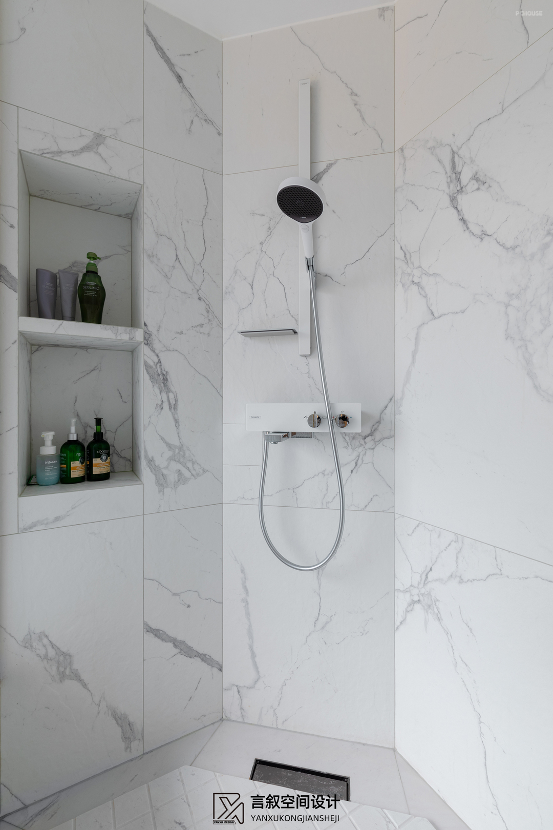 转角做独立淋浴间,壁龛储物、斜切墙面壁挂恒温花洒。地面加高整块石材并做扣缝,石面格栅防滑,加高后下水更流畅。