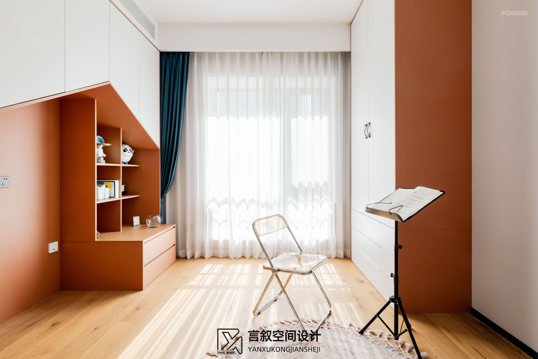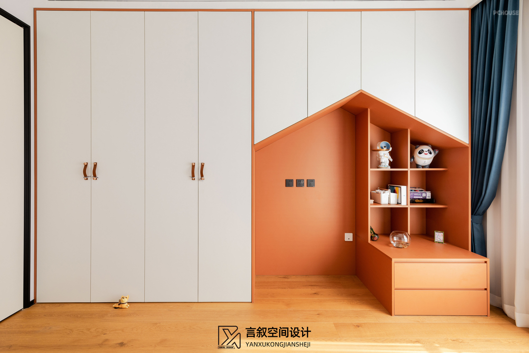 儿童房整体采用定制木作一体设计,通顶造型定制柜不仅解决收纳问题还非常有装饰效果。细节上橙色背板做全烤漆,拼接出的橙色线框展现出整个空间的点、线、面的色彩比例分割。