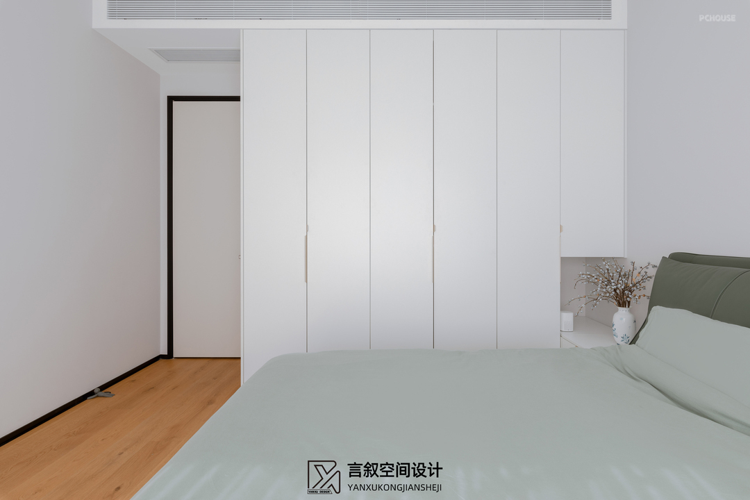 软包床头方便老人倚靠,纯白的床头柜与墙面、衣柜浑然一体。
