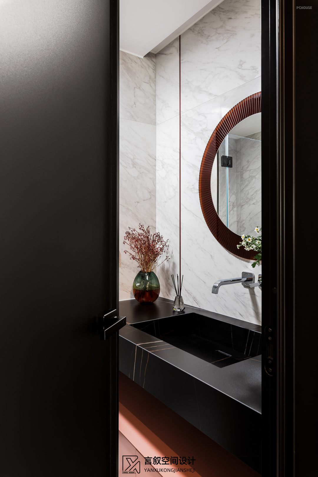 客卫在入户玄关旁,供日常使用,宾客临时到访也不必进入屋主的休息区。同样的加高黑色实木门,尽显品质感。