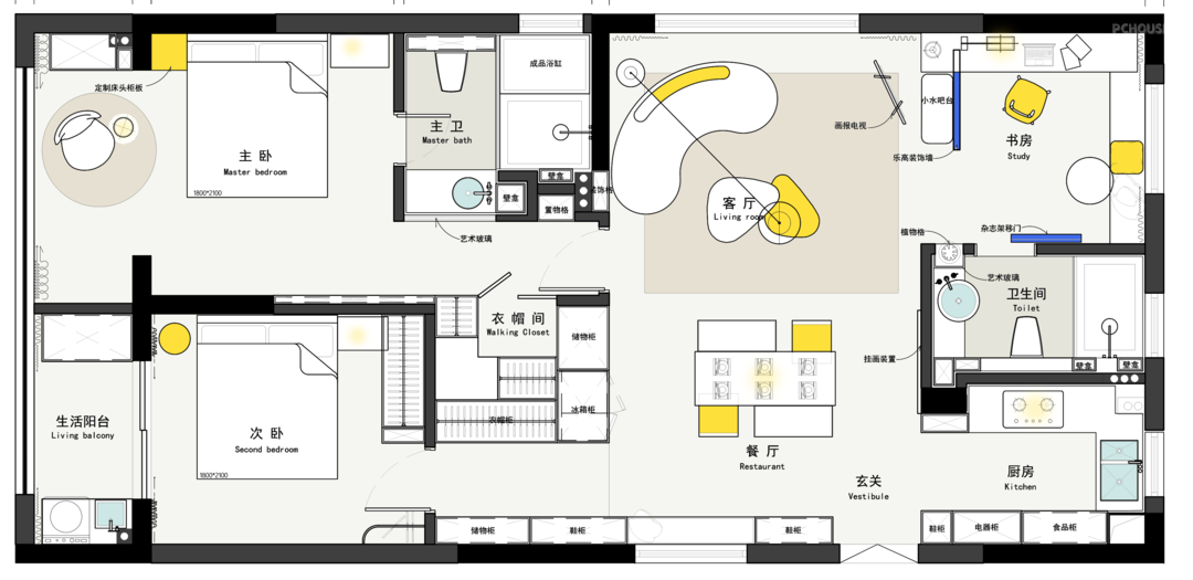 西边客厅采光极佳,不设任何遮挡。厨房使用频率较低,创造与外卫和谐共存的布局。北边房间面积小,采光较弱,将其融入公区,增加空间通透感。朝南的两间房,房型周正,连接阳台,满足更多的置物收纳需求。考虑承重问题,塑造五金衣帽间,安全实用。