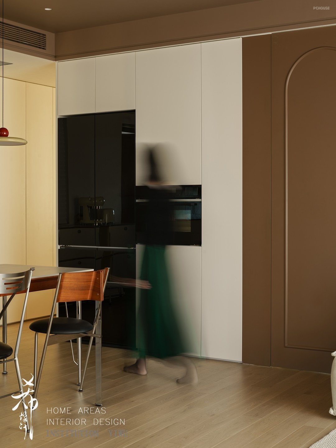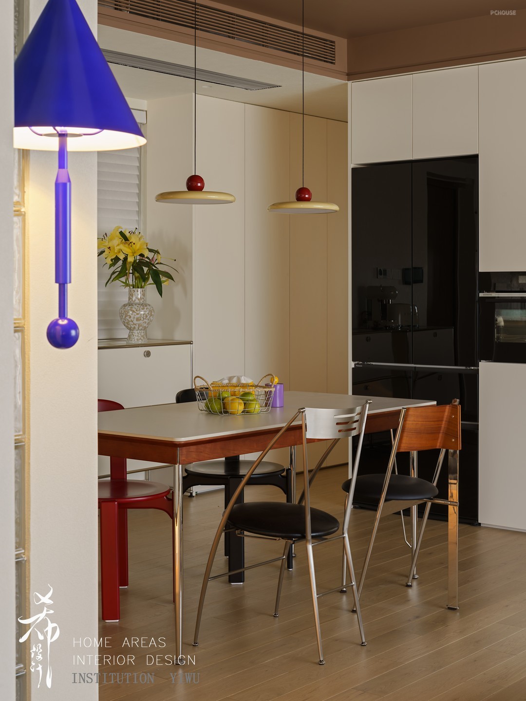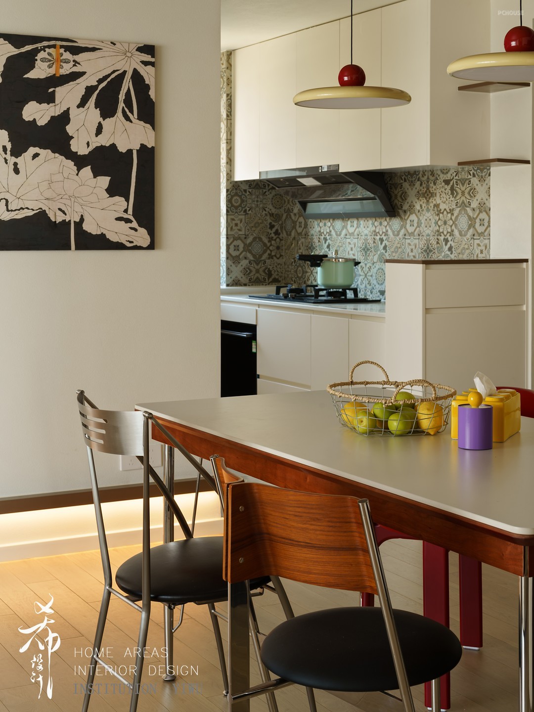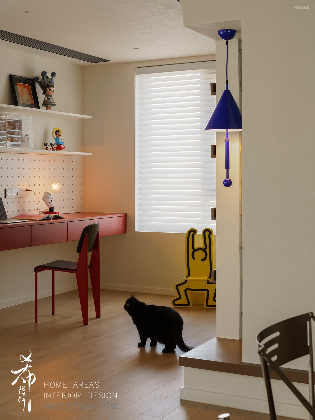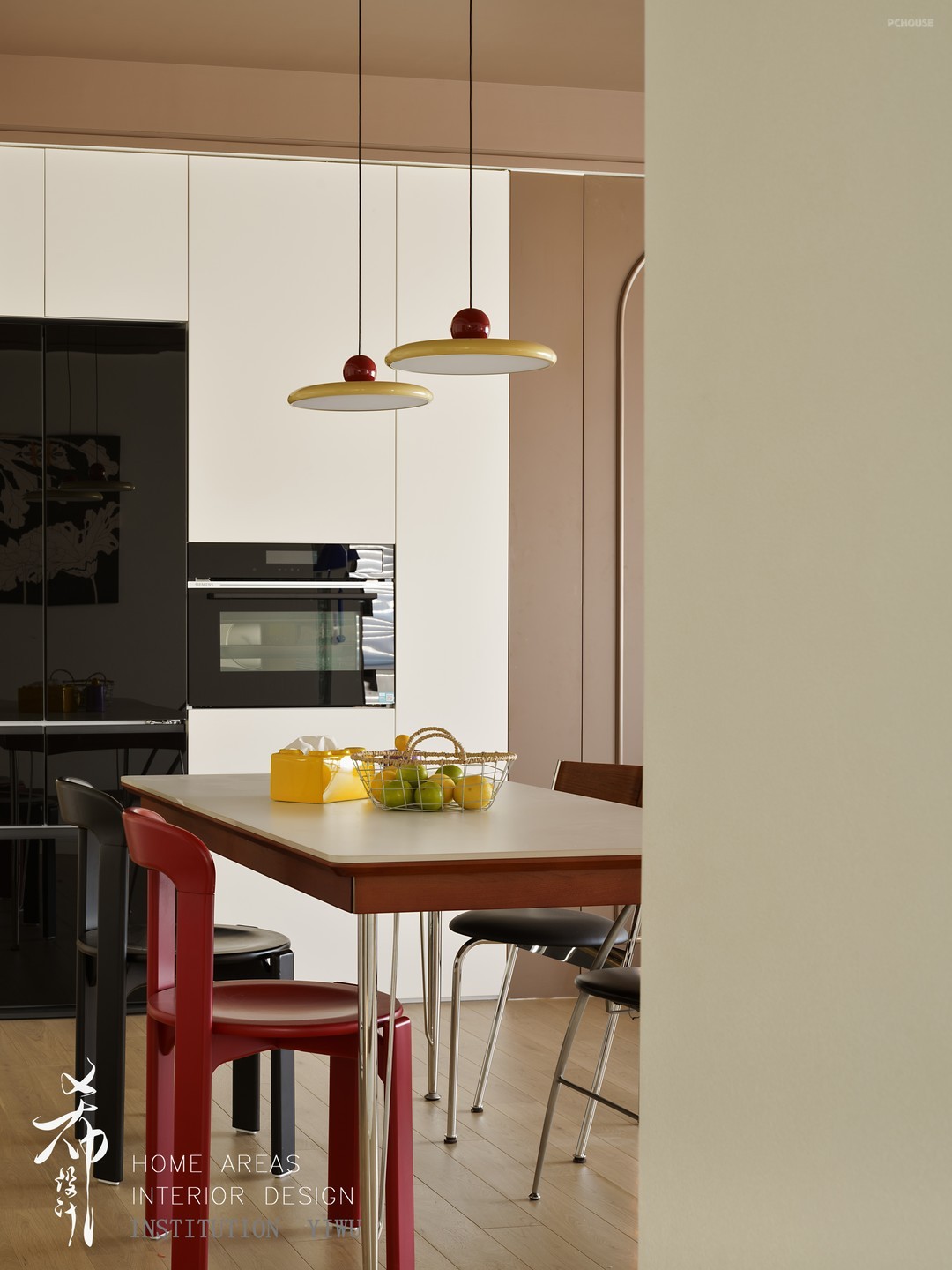 运用重色块表达门的存在感,自然区分了会客场景与就餐场域。紧贴门框的壁龛,带领精致藏品跃动客厅氛围,对话地面的波点,呼应书房的“缤纷多彩”。斜置电视,展现客厅与书房畅通的沟通方式。
