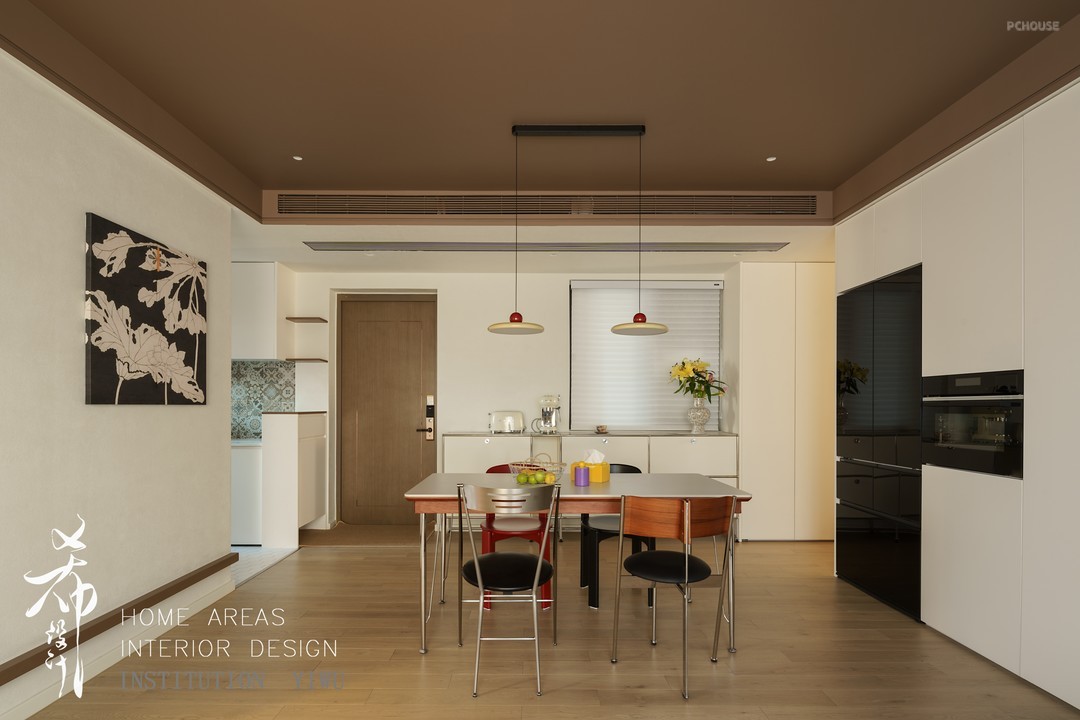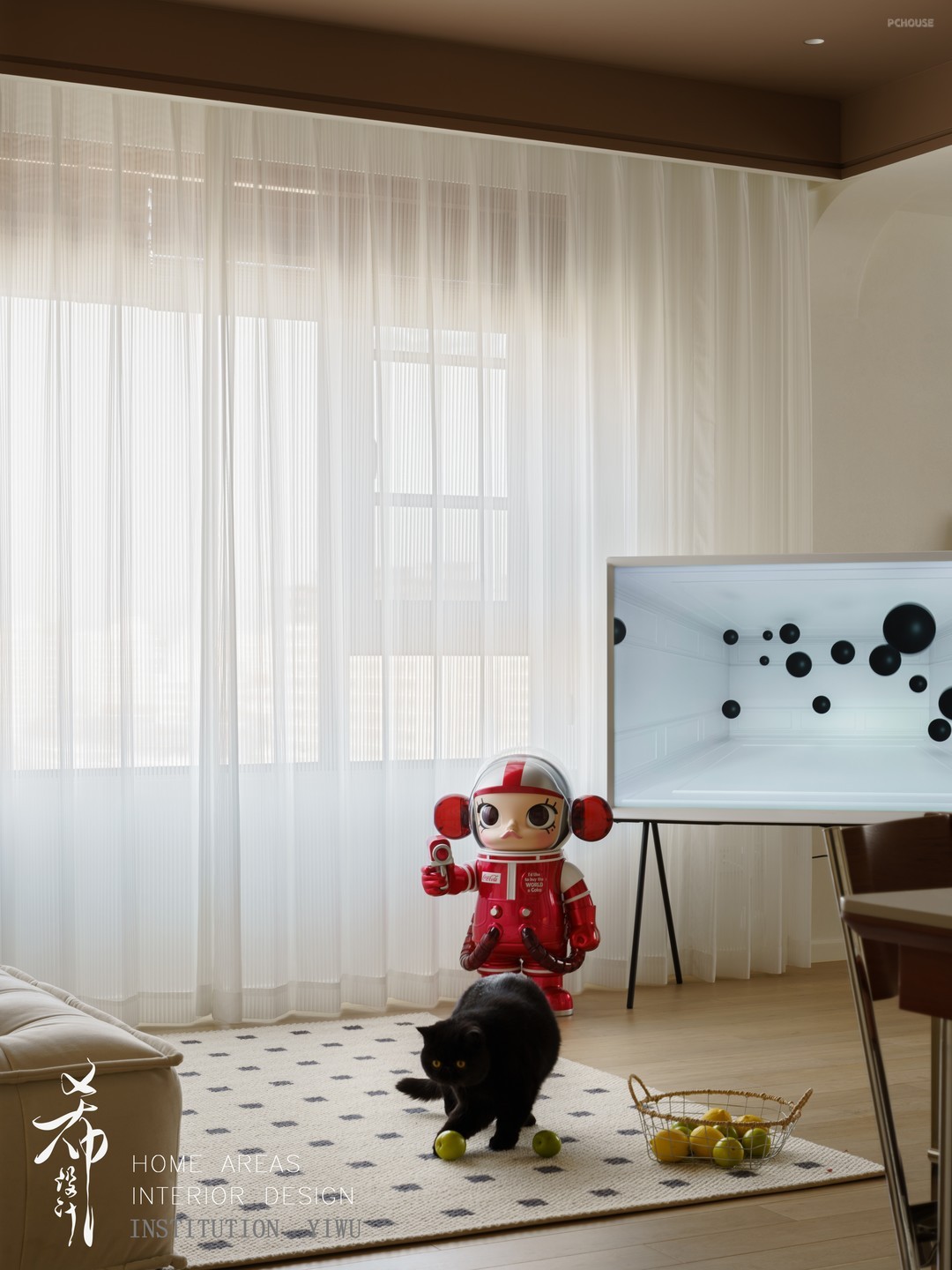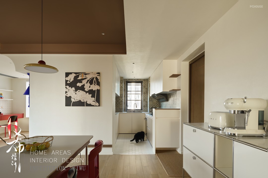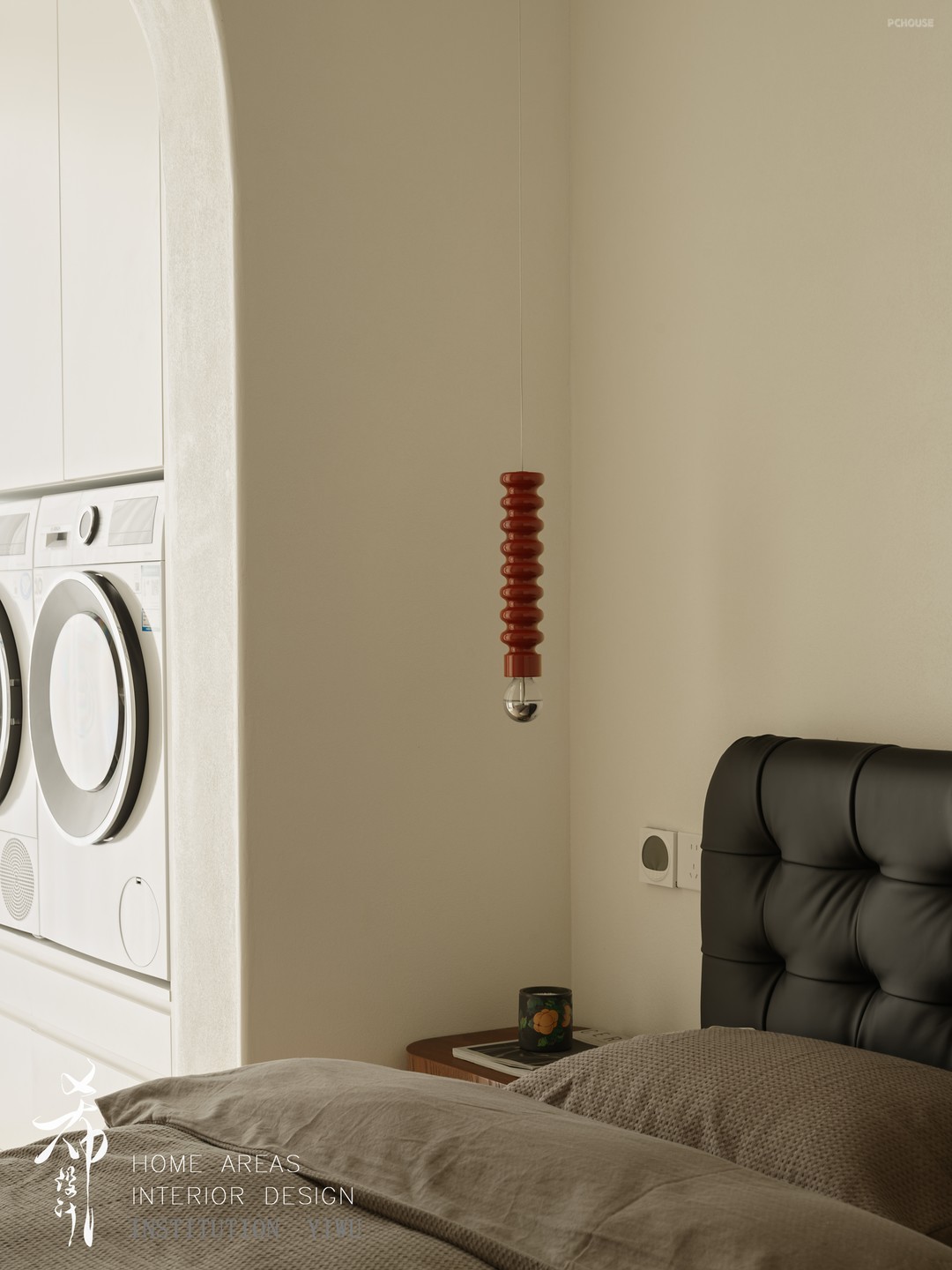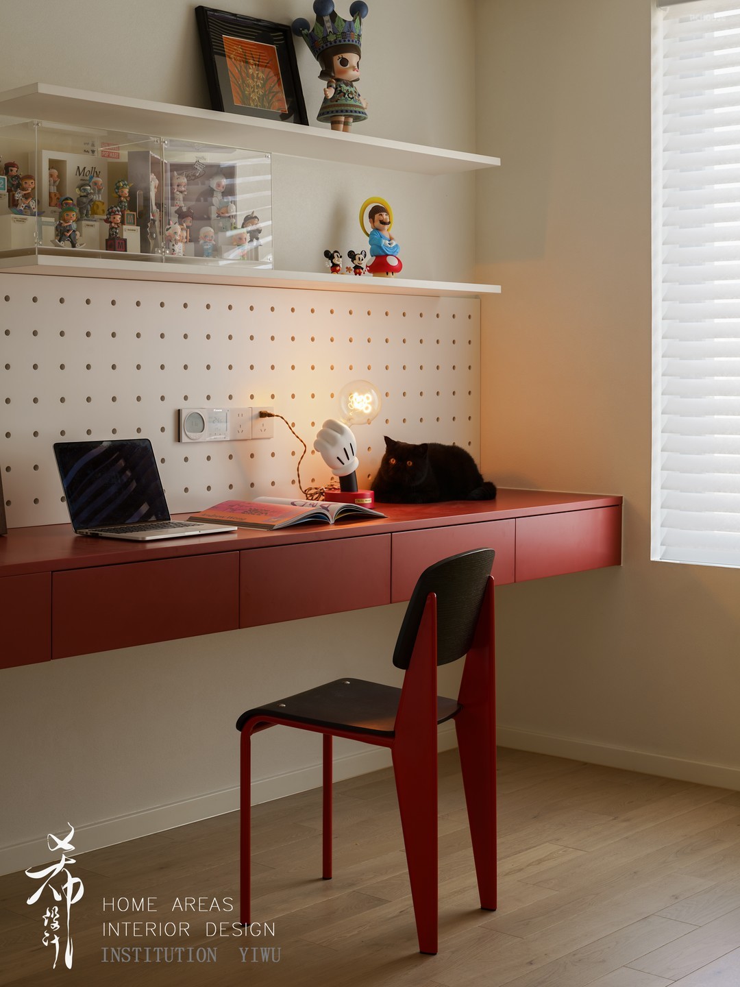 运用重色块表达门的存在感,自然区分了会客场景与就餐场域。紧贴门框的壁龛,带领精致藏品跃动客厅氛围,对话地面的波点,呼应书房的“缤纷多彩”。斜置电视,展现客厅与书房畅通的沟通方式。