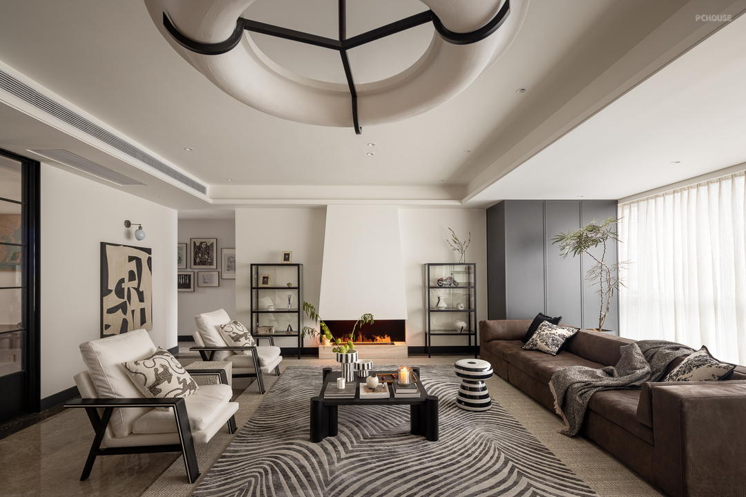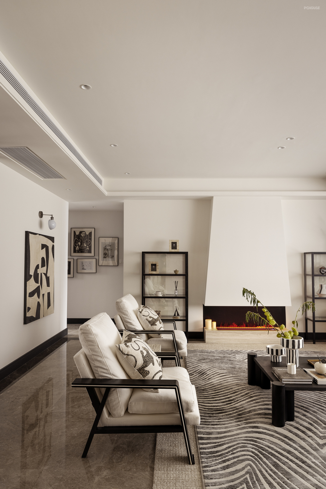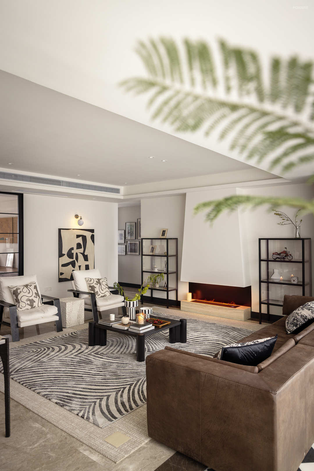 客厅是一家生活的中心场所。设计师通过壁炉氛围,围合出一片轻松惬意的会客区。来访者一入户,便能被浓厚的艺术气息所包围。