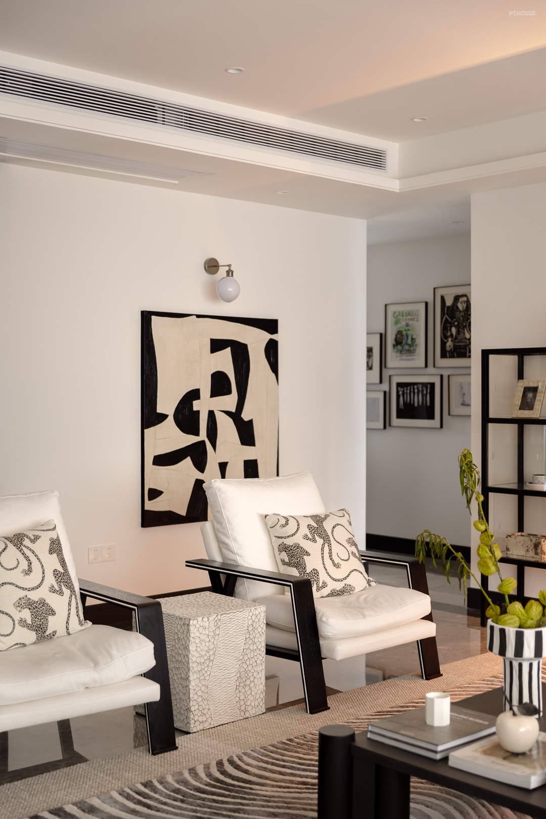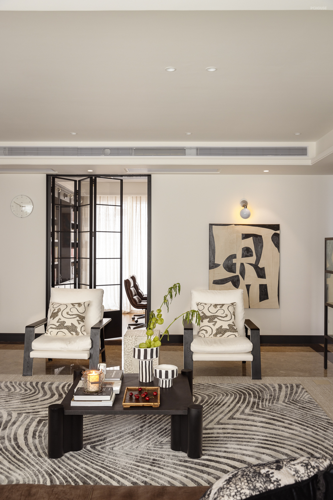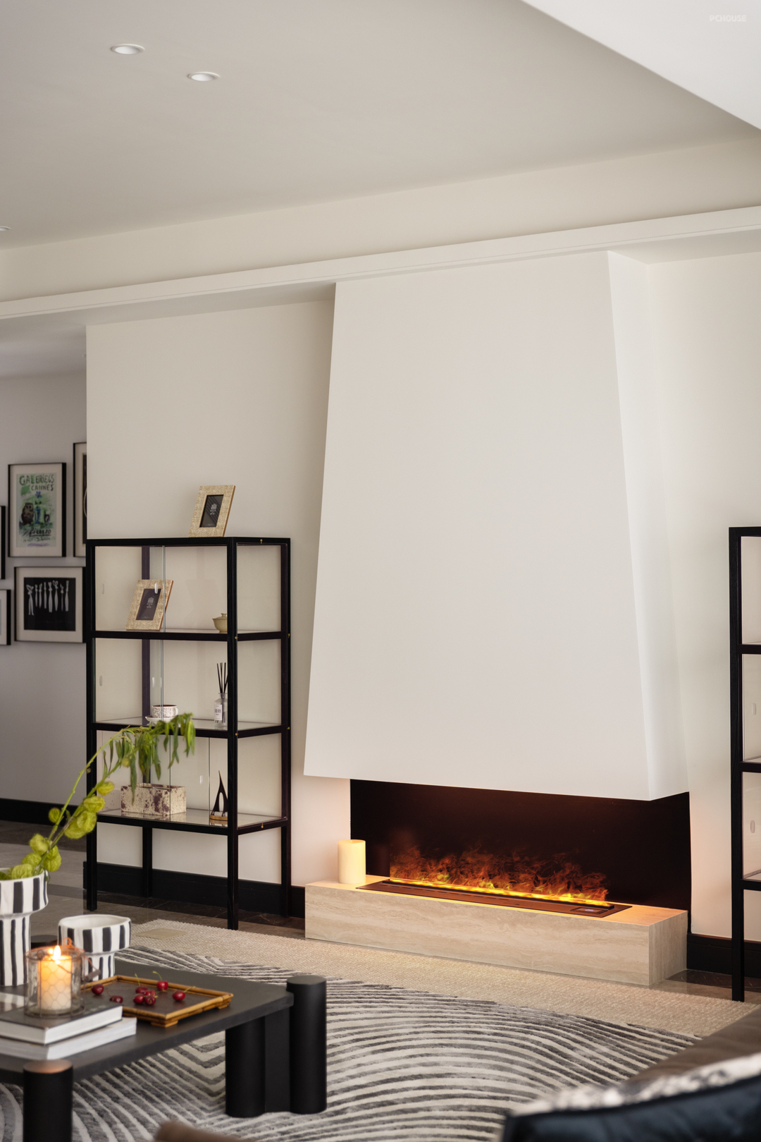 客厅是一家生活的中心场所。设计师通过壁炉氛围,围合出一片轻松惬意的会客区。来访者一入户,便能被浓厚的艺术气息所包围。