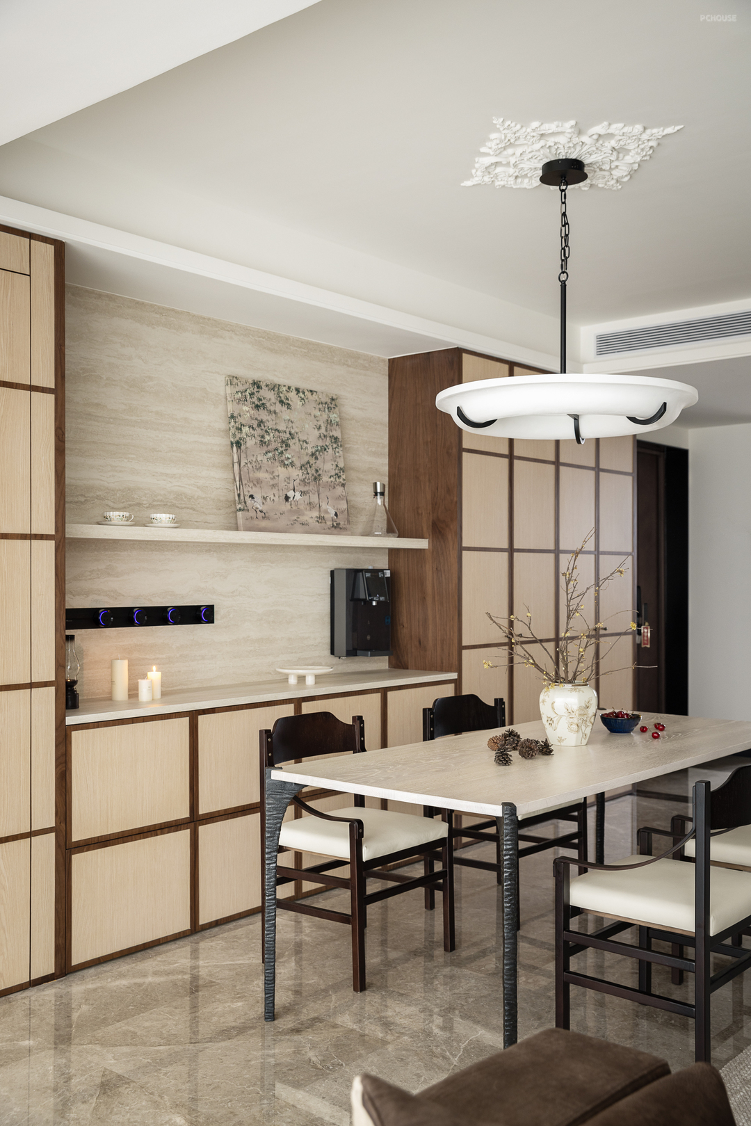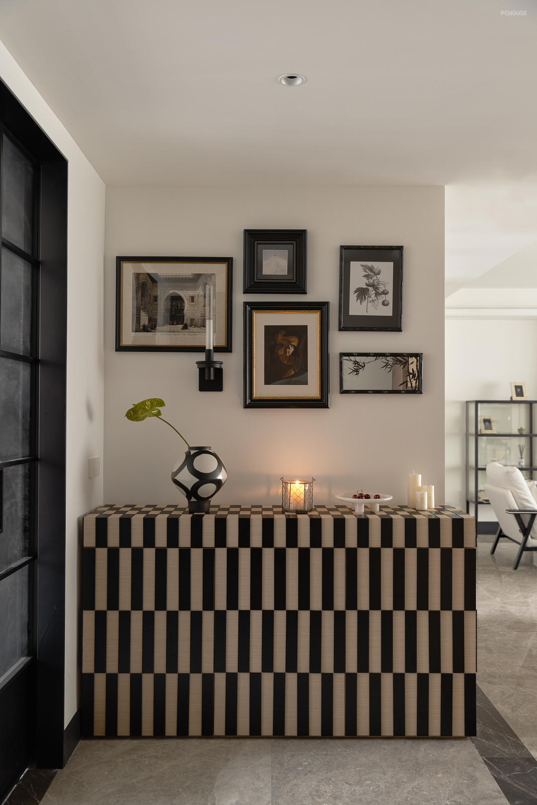 餐边柜作为客餐厅空间的一大主体,是这其中最自由又活力的一笔,强烈的线条感与块面感,将复古与异想天开结合得恰到好处。