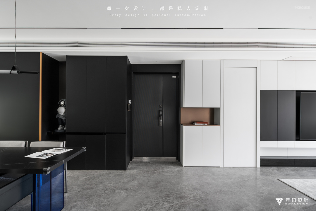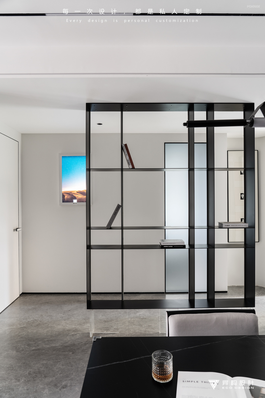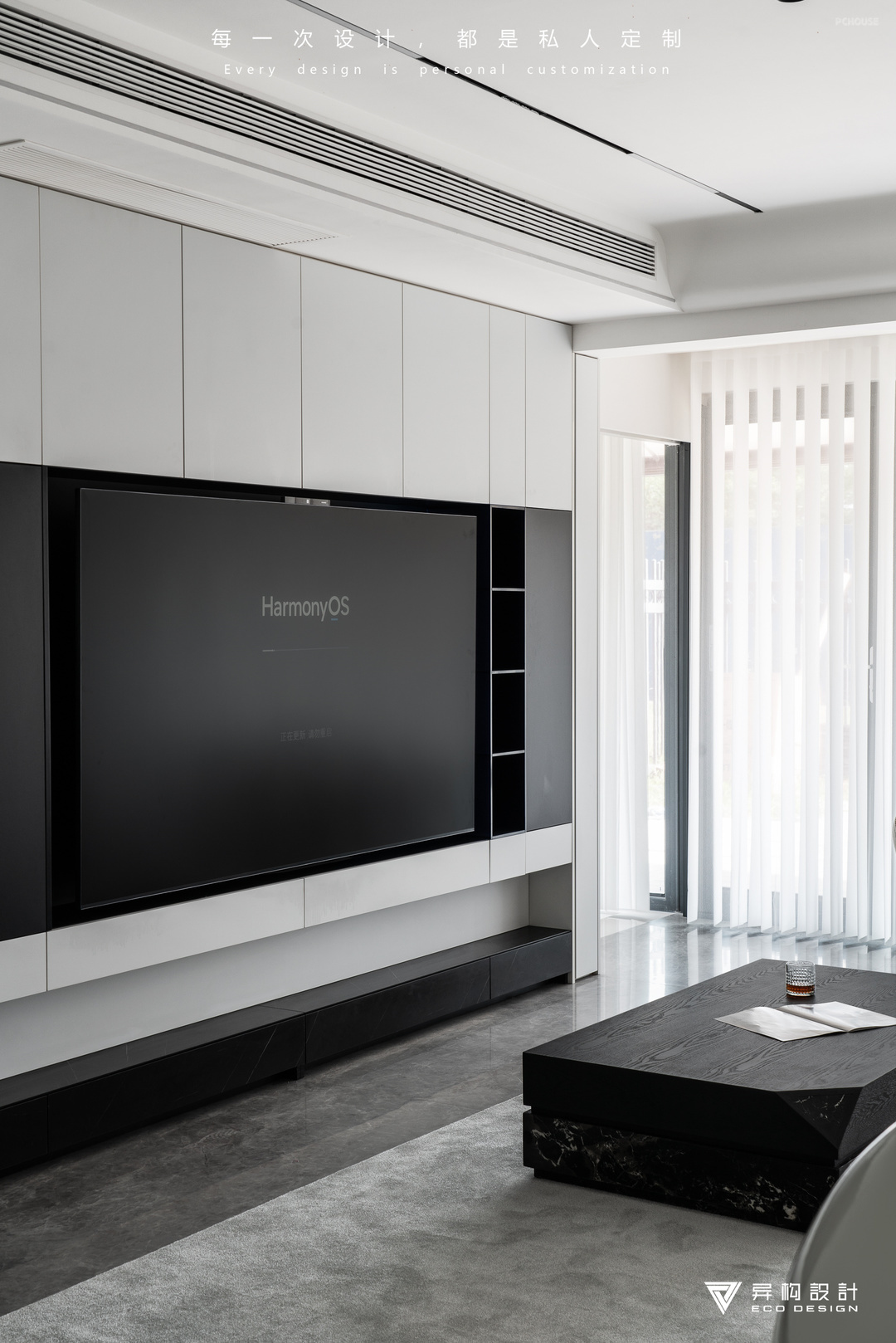 整个客厅简约高级,极简的黑白棕配色搭配整面落地窗,一踏进家门就能感受到简约风的清爽高级。电视背景做满墙电视柜设计,恰到好处的悬空留白与色彩对撞,增加客厅收纳空间的同时不显压抑,整体轻盈舒适。