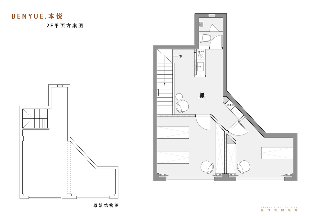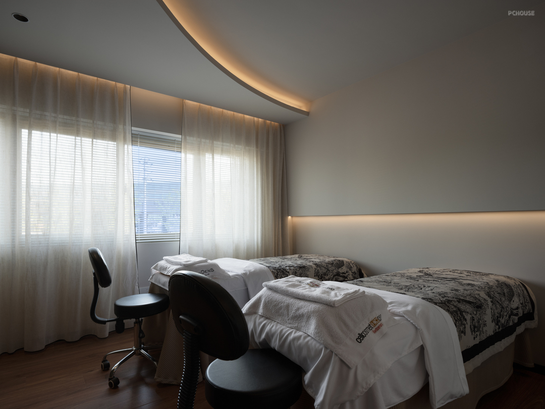 空间分楼上楼下两层,一楼主要是接待、茶歇、问诊室、以及厨房操作间可以平常给客人准备餐食。二楼的部分主要以包间为主,单人或多人,可供客人朋友休息护肤。