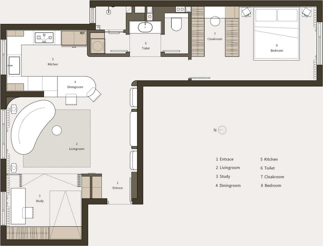 屋主在设计前就已预定了Ligneous Reset Plough Sofa ,我们反向思考如何通过设定好家具作为空间主轴,进而安排空间区域的独立与兼容。在设计过程中,屋主又陆续收入了不少中古的家具,为空间增添了时间的厚度和温度。