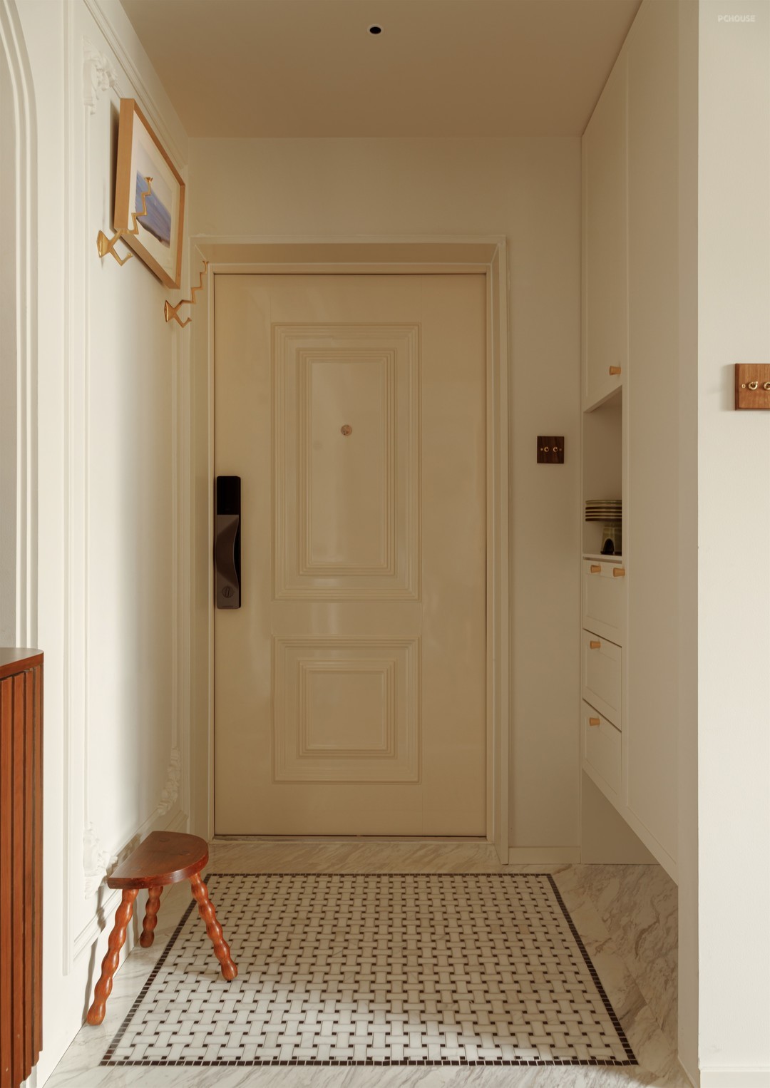 入户玄关柜以抽屉和鞋柜的形式组合,便于更加细致的分类收纳,我们将玄关柜下方挑空30厘米,让柜体视觉上变得轻盈,同时可以将换鞋凳收纳到下方,保持过道通畅。原来入户门是红木色调,我们做了调色处理,让玄关空间更加统一敞亮,带有地毯编织感的马赛克,营造回家的仪式感。