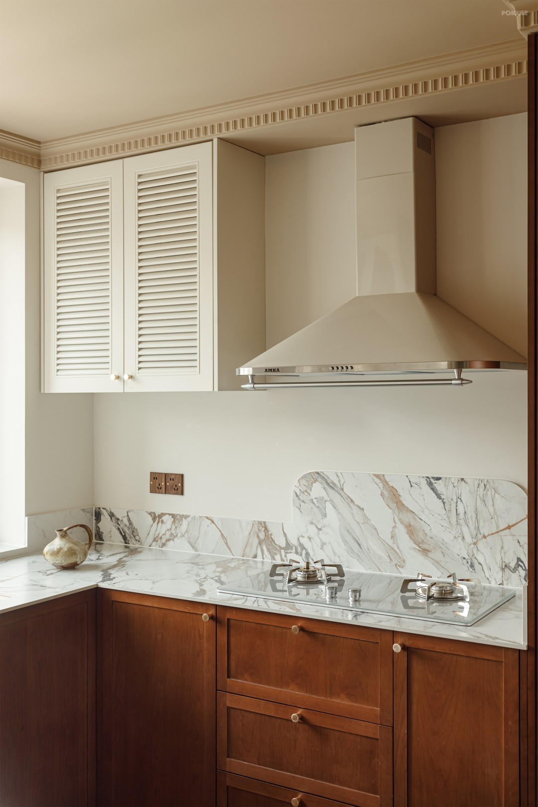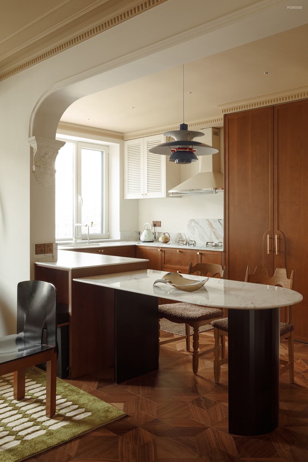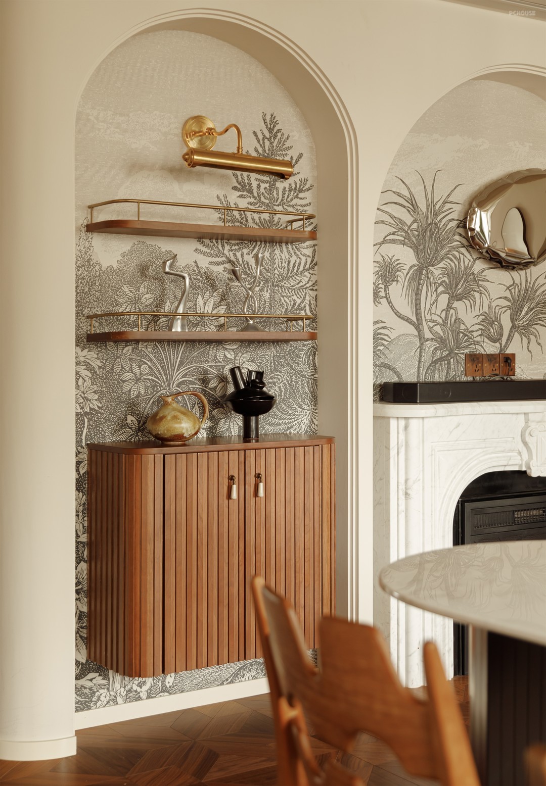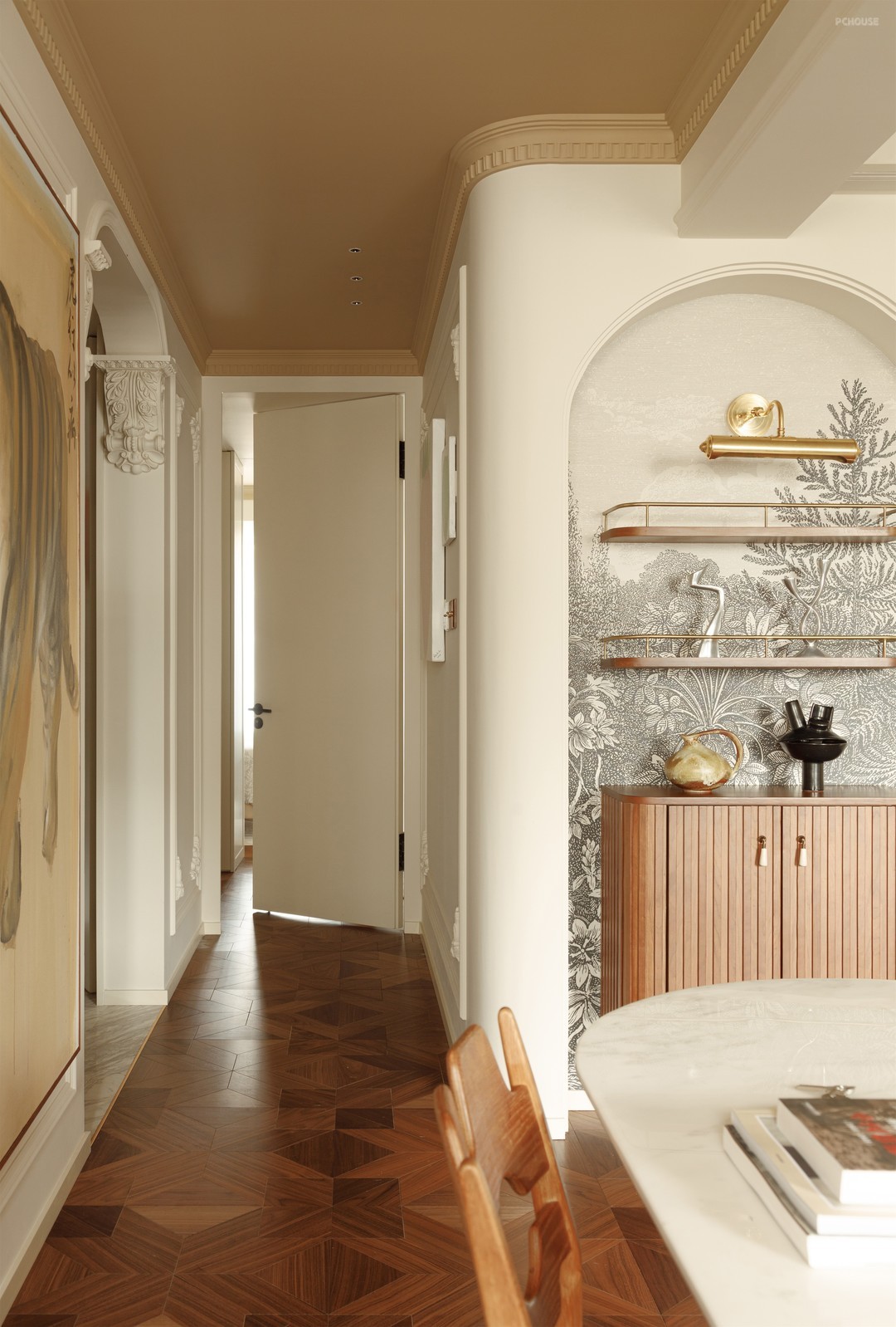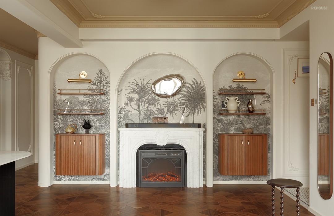 在玄关通往厨房的动线上用“minibar”的概念去打造,弱化动线的夯长感,同时也增加了动线使用性,闲来约三五好友家中派对,家里的微醺胜过市井喧嚣的酒场地。拱形壁龛上的边顶里我们预埋了120寸的投影幕布,若是一个人独处,来一部经典电影,也是种不错的沉浸治愈体验。