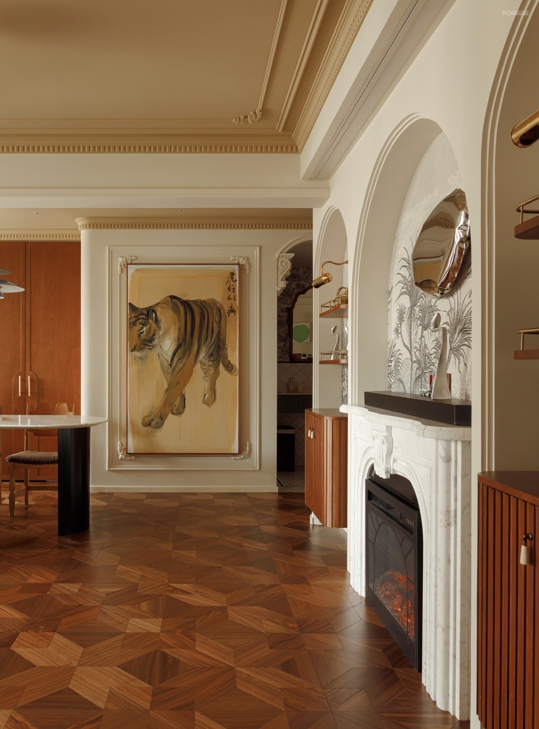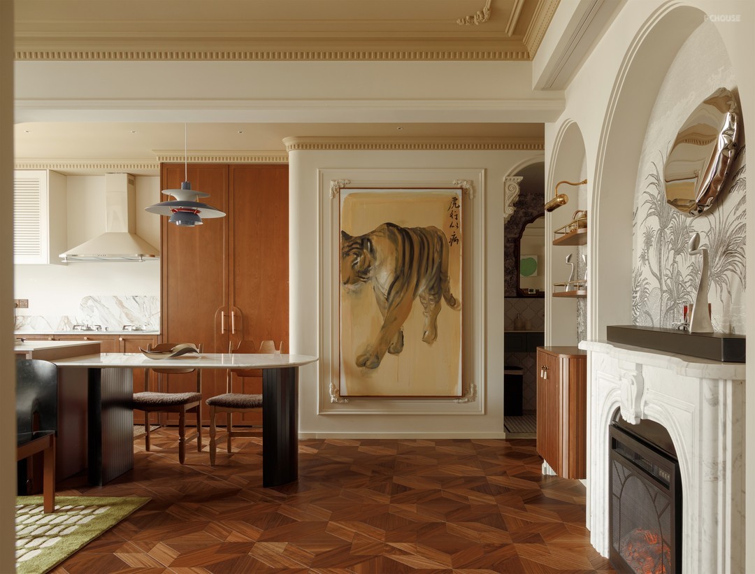 玄关端景挂放的是屋主收藏张涉嫌的作品【虎行似病】,强者往往都是自敛锋芒,隐忍行志,画面色调温润笔触洗练,是屋主很喜欢的一件藏品,为动线增加了驻足的“间隙”,使空间增加了几分生趣。