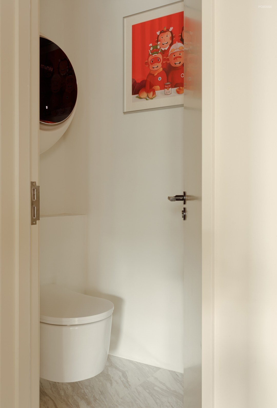 马桶间墙上挂的是屋主收藏的陈建周的作品,画家以幽默、好玩、有趣为主题,创作了一系列悟空形象的版画,希望给人们带来好的心情去面对生活,让不大的马桶间变得轻松有趣。