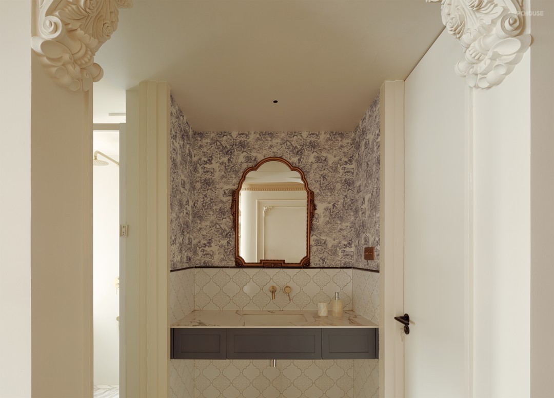 屋主十分重视卫浴空间的打造,我们将原厨房与公卫合并,设置成三分离格局的卫浴空间。盥洗间中间是洗面台,延续空间法式复古的氛围,我们选用了复古镜+半墙壁纸+菱格小砖搭配,灰蓝色与古铜金的碰撞,搭配出典雅清新的意向。