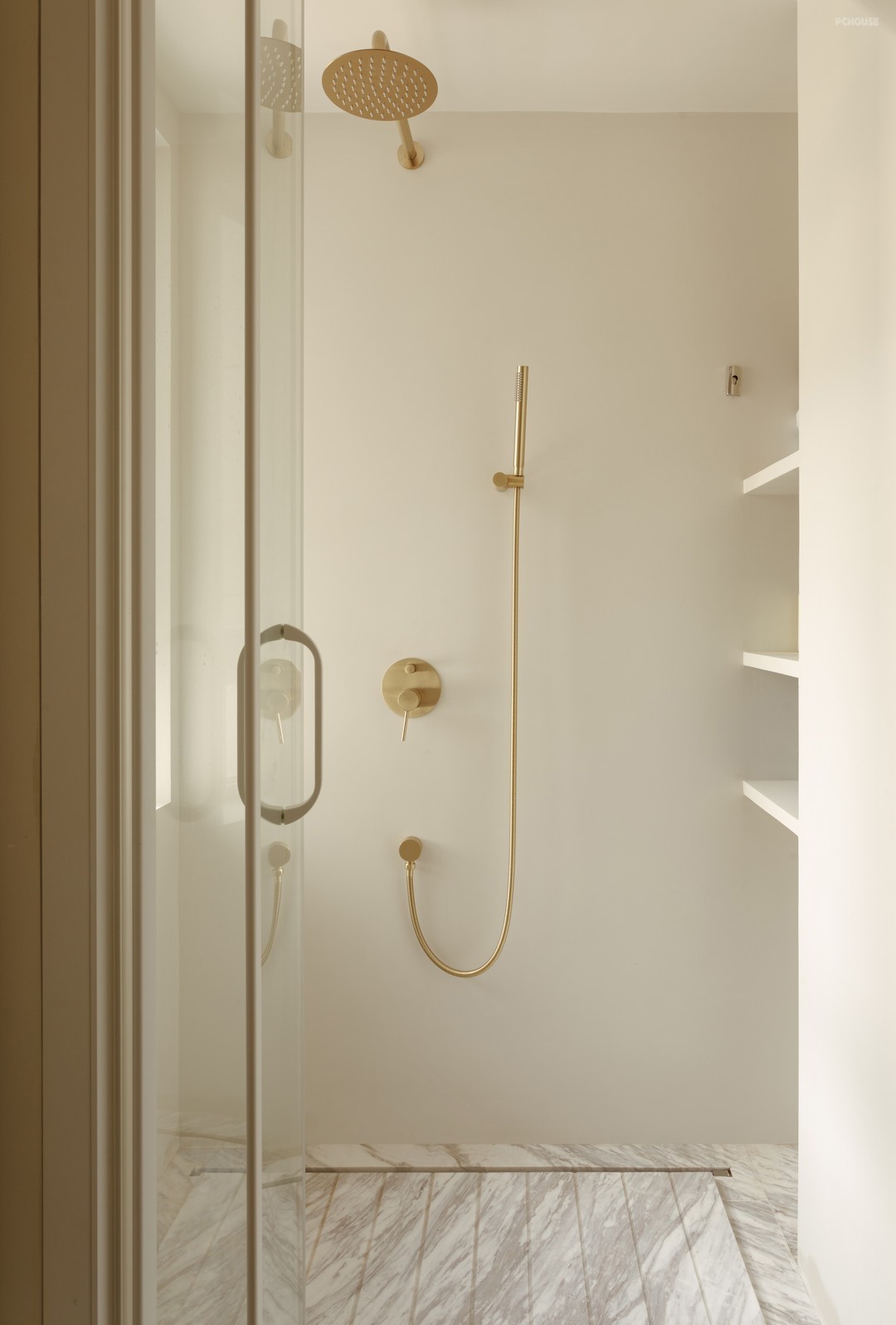 淋浴房和马桶间分别在洗面台的左右两侧,淋浴房内做了干湿分区,隔离出的干区为家政洗衣区,实现沐浴更衣后无缝衔接脏衣清洗工作,提高家政效率和生活品质。