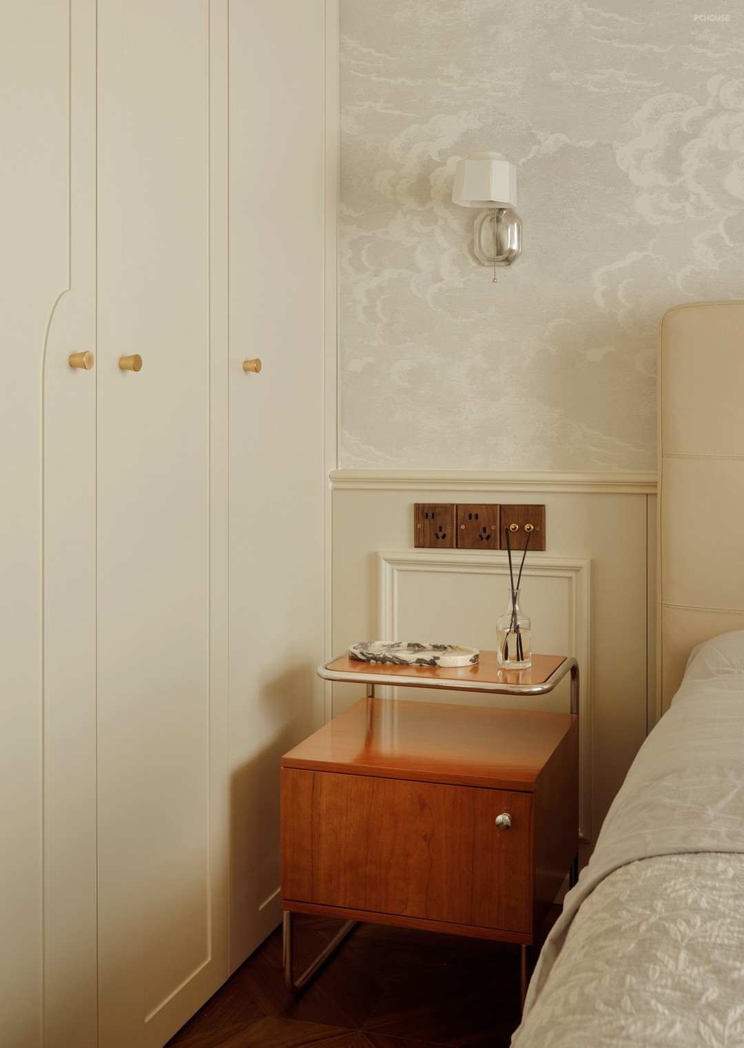 4.将原主卫打开拓展到主卧空间,通过柜体的围合成半开放衣帽间,增加了卧室功能性也倍化了空间感受。